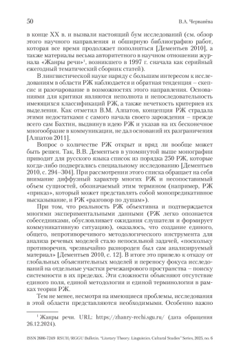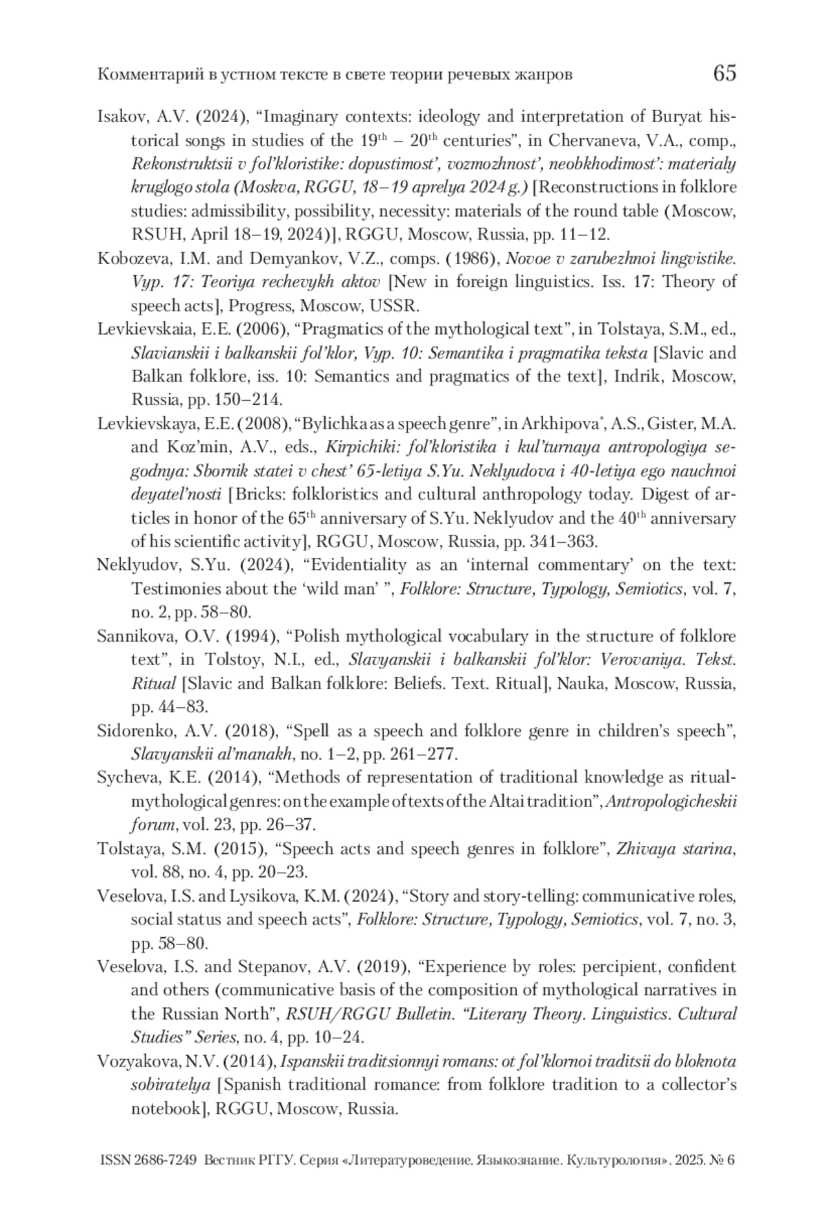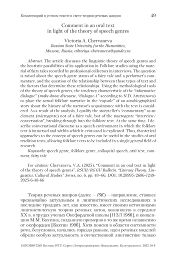 ЧЕРВАНЁВА В. А. КОММЕНТАРИЙ В УСТНОМ ТЕКСТЕ В СВЕТЕ ТЕОРИИ РЕЧЕВЫХ ЖАНРОВ // ВЕСТНИК РГГУ. СЕРИЯ «ЛИТЕРАТУРОВЕДЕНИЕ. ЯЗЫКОЗНАНИЕ. КУЛЬТУРОЛОГИЯ». 2025. № 6