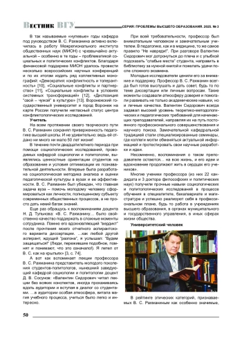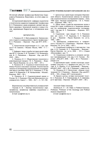 ГЛУХОВА А. В. ВАЛЕНТИН СИДОРОВИЧ РАХМАНИН. УЧЕНЫЙ. УЧИТЕЛЬ. УНИВЕРСИТЕТСКИЙ ЧЕЛОВЕК: НАУЧНО-ПЕДАГОГИЧЕСКИЙ АНАЛИЗ ПЕРСОНАЛЬНОГО ОПЫТА (К ЮБИЛЕЮ ПРОФЕССОРА В. С. РАХМАНИНА) // ВЕСТНИК ВОРОНЕЖСКОГО ГОСУДАРСТВЕННОГО УНИВЕРСИТЕТА. СЕРИЯ: ПРОБЛЕМЫ ВЫСШЕГО ОБРАЗОВАНИЯ. 2025. № 3