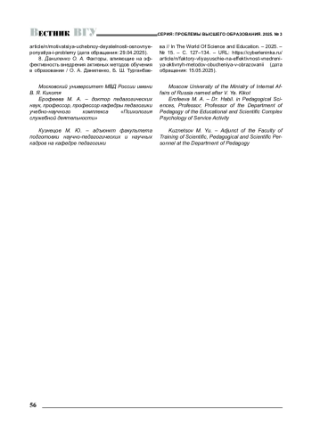 8. Даниленко О. А. Факторы, влияющие на эффективность внедрения активных методов обучения в образовании / О. А. Даниленко, Б. Ш. Турганбаева // In The World Of Science and Education. - 2025. -№ 15. - С. 127-134. - URL: https://cyberleninka.ru/article/n/faktory-vliyayuschie-na-effektivnost-vnedreni-ya-aktivnyh-metodov-obucheniya-v-obrazovanii (дата обращения: 15.05.2025).