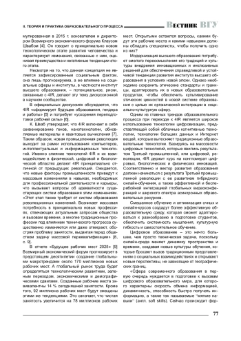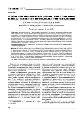 Цель исследования - рассмотреть концепцию Четвертой промышленной революции (4IR), предложенную Клаусом Швабом для описания текущей трансформации техносферы, характеризующейся сочетанием цифровых, физических и биологических систем, определить вызовы высшему образованию в условиях новой реальности, сделать выводы о приоритетах развития высшего образования в эпоху 4IR. В статье анализируются изменения системы высшего образования и ставятся вопросы о том, как университеты должны проводить обучение в эпоху 4IR. Некоторые из этих вопросов требуют технологических ответов, другие представляют философский вызов, поскольку касаются этики, ценностей и смыслов.