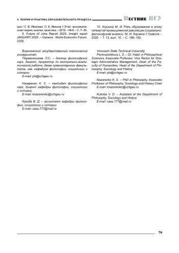 10. Корзина М. И. Роль образования в эпоху четвертой промышленной революции (социально-философский анализ) / М. И. Корзина // Грамота - 2020. - Т. 13, вып. 10. - С. 186-192.
