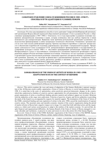 В статье рассматриваются способы и пути адаптации Самарской (Куйбышевской) региональной организации Всероссийской творческой общественной организации «Союз художников России» к общественным трансформациям в 1985-1998 гг. Отмечается, что в годы перестройки художники позитивно восприняли демократические изменения в стране, которые понимались ими как свобода творчества и новые возможности для самопрезентации. Выявлены такие проблемы региональной организации художников, как недостаточное финансирование и слабое материально-техническое обеспечение. Отношения с органами власти на этом этапе носили двойственный характер. Критика пассивности партийных и советских органов власти в обеспечении потребностей отделения сопровождалась просьбами о материальной поддержке. Прекращение деятельности Союза художников СССР, централизованного финансирования и государственного регулирования культуры в начале 1990-х гг. обусловили трансформацию региональных творческих союзов. Неопределённость статуса и неустойчивость экономического положения творческой организации в период рыночных реформ в России негативно повлияли на её имидж. Отмечается, что как отдельные художники, так и организация в целом использовали различные социальные практики для приспособления к реалиям рыночной экономики. Доказано, что, несмотря на финансовые и организационные трудности, Самарскому отделению Союза художников России удалось преодолеть «разброд и шатания», сохранить единство и восстановить свою роль в художественной жизни Самарской области.
