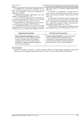 АВЕТИСЯН В. Р. ИСТОРИЯ СТАНОВЛЕНИЯ И РАЗВИТИЯ МЕТОДОВ ОБУЧЕНИЯ В БИОЛОГИЧЕСКОМ ОБРАЗОВАНИИ ШКОЛЬНИКОВ (ДО XX СТОЛЕТИЯ) // САМАРСКИЙ НАУЧНЫЙ ВЕСТНИК. 2024. ТОМ 13, № 1
