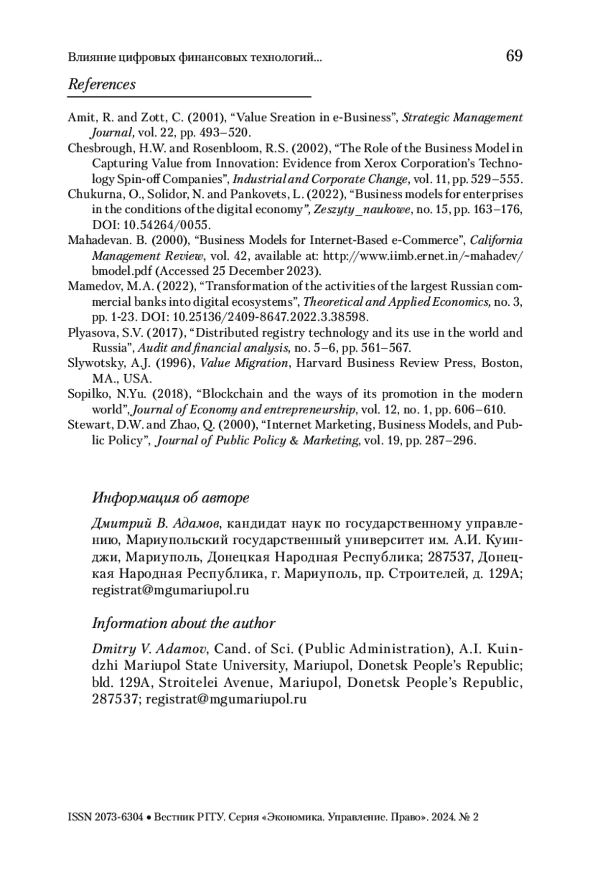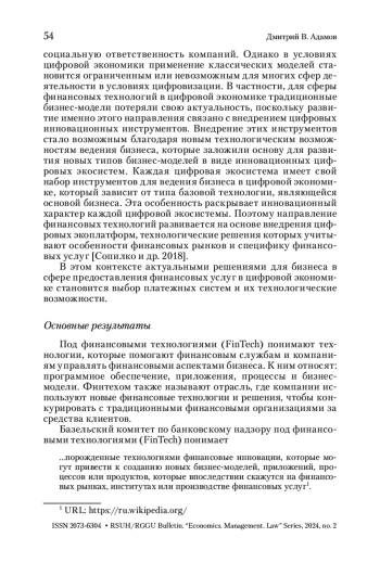 АДАМОВ Д. В. ВЛИЯНИЕ ЦИФРОВЫХ ФИНАНСОВЫХ ТЕХНОЛОГИЙ НА ИННОВАЦИОННЫЕ РЕШЕНИЯ В ФИНАНСОВОМ СЕКТОРЕ // ВЕСТНИК РГГУ. СЕРИЯ: ЭКОНОМИКА. УПРАВЛЕНИЕ. ПРАВО. 2024. № 2