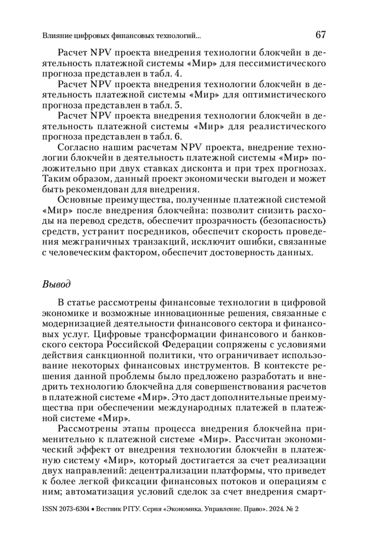 Предложен и обоснован процесс внедрения технологий блокчейн в работу платежной системы «Мир». Сформированы проектные предложения и обоснован проект внедрения технологий блокчейн в работу платежной системы «Мир» с последующим расчетом экономического эффекта от практической реализации проектных предложений.