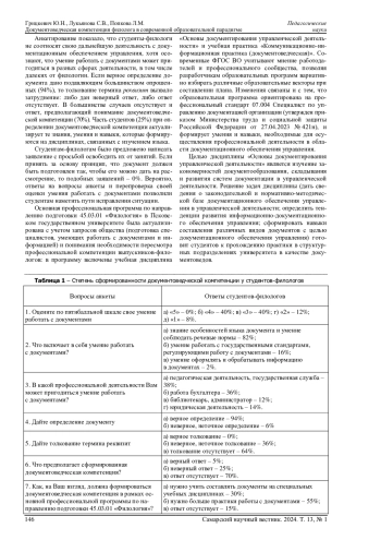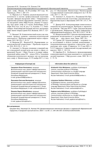 ГРИЦКЕВИЧ Ю. Н., ЛУКЬЯНОВА С. В., ПОПКОВА Л. М. ДОКУМЕНТОВЕДЧЕСКАЯ КОМПЕТЕНЦИЯ ФИЛОЛОГА В СОВРЕМЕННОЙ ОБРАЗОВАТЕЛЬНОЙ ПАРАДИГМЕ // САМАРСКИЙ НАУЧНЫЙ ВЕСТНИК. 2024. ТОМ 13, № 1