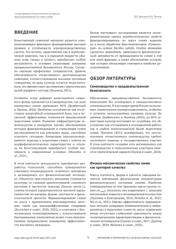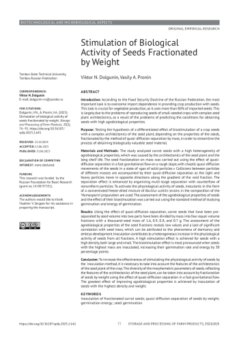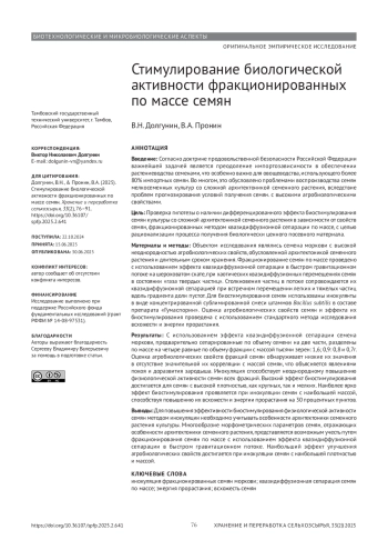 ДОЛГУНИН В. Н., ПРОНИН В. А. СТИМУЛИРОВАНИЕ БИОЛОГИЧЕСКОЙ АКТИВНОСТИ ФРАКЦИОНИРОВАННЫХ ПО МАССЕ СЕМЯН // ХРАНЕНИЕ И ПЕРЕРАБОТКА СЕЛЬХОЗСЫРЬЯ. 2025. № 2, ТОМ 33