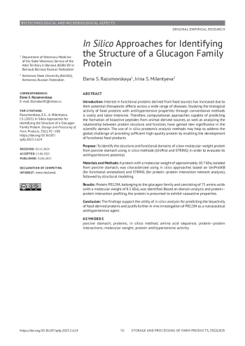 Цель: Идентификация структуры и функциональных доменов низкомолекулярного белка из свиных желудков методом in silico с использованием UniProt и STRING, с целью оценки его антигипертензивного потенциала. Материалы и методы: Белок массой ~10,7 кДа, выделенный из свиных желудков, был охарактеризован с использованием in silico подходов на базе UniProtKB (функциональная аннотация) и STRING (анализ PPI-сетей), с последующим структурным моделированием.