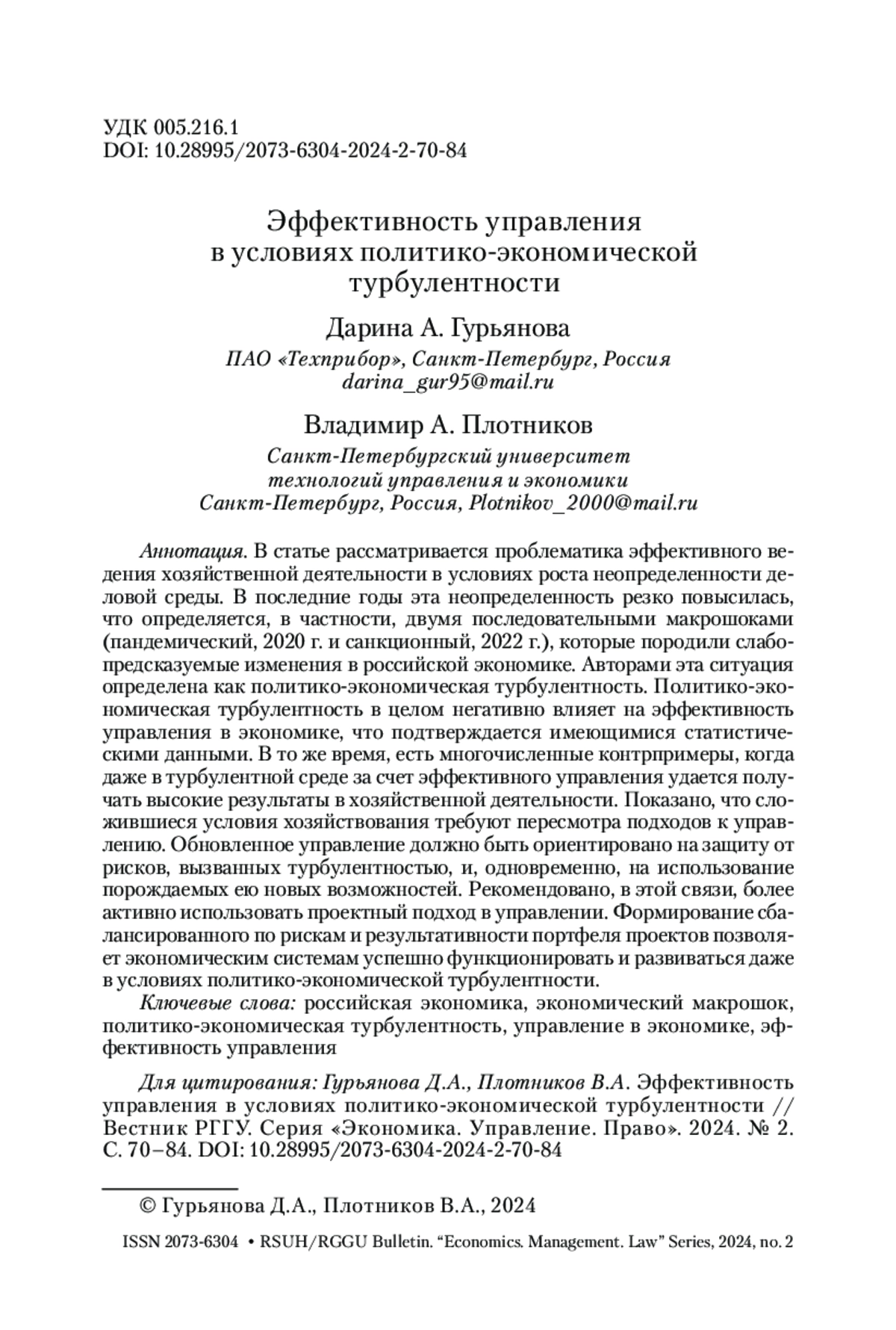 В статье рассматривается проблематика эффективного ведения хозяйственной деятельности в условиях роста неопределенности деловой среды. В последние годы эта неопределенность резко повысилась, что определяется, в частности, двумя последовательными макрошоками (пандемический, 2020 г. и санкционный, 2022 г.), которые породили слабопредсказуемые изменения в российской экономике. Авторами эта ситуация определена как политико-экономическая турбулентность. Политико-экономическая турбулентность в целом негативно влияет на эффективность управления в экономике, что подтверждается имеющимися статистическими данными. В то же время, есть многочисленные контрпримеры, когда даже в турбулентной среде за счет эффективного управления удается получать высокие результаты в хозяйственной деятельности. Показано, что сложившиеся условия хозяйствования требуют пересмотра подходов к управлению. Обновленное управление должно быть ориентировано на защиту от рисков, вызванных турбулентностью, и, одновременно, на использование порождаемых ею новых возможностей. Рекомендовано, в этой связи, более активно использовать проектный подход в управлении. Формирование сбалансированного по рискам и результативности портфеля проектов позволяет экономическим системам успешно функционировать и развиваться даже в условиях политико-экономической турбулентности.