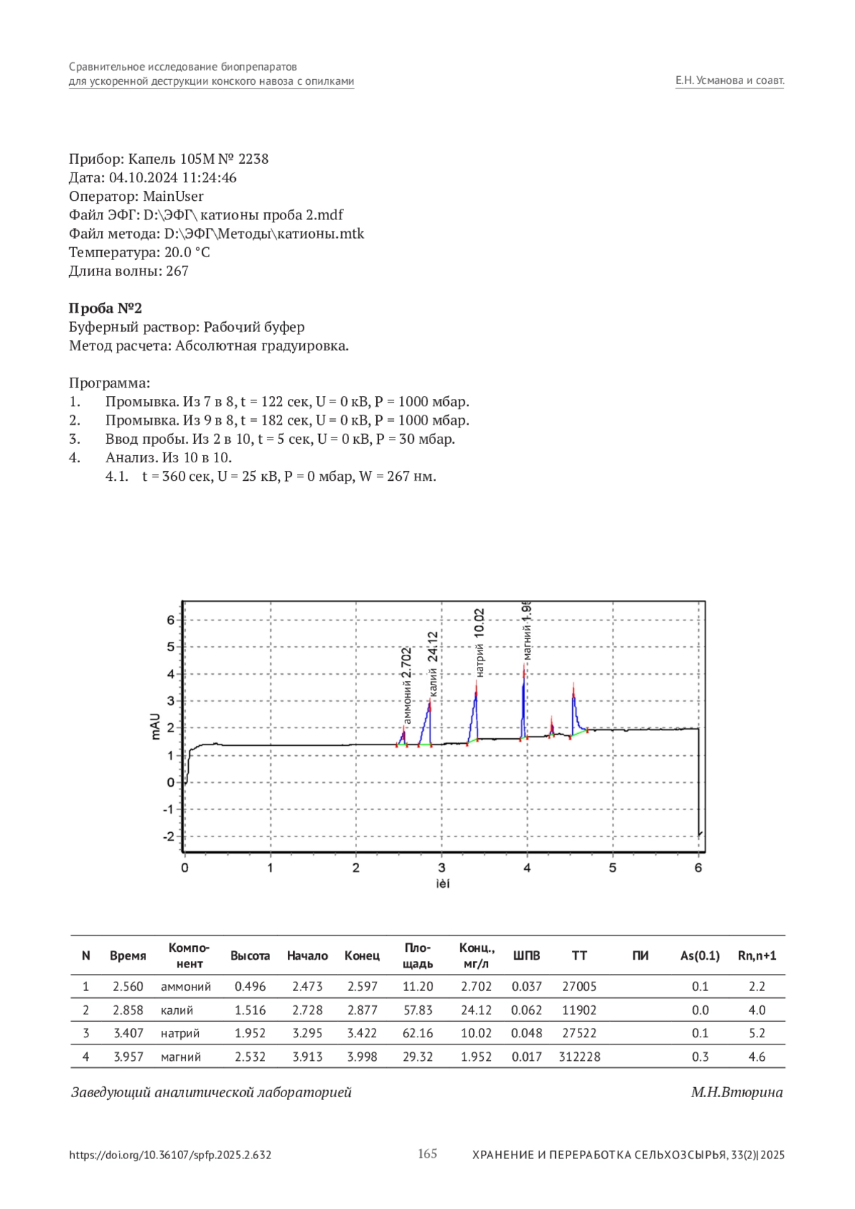 Материалы и методы: Эксперимент включал заложение буртов из свежего конского навоза с опилочной подстилкой с добавлением биопрепаратов «Феркон Д», «Феркон ДН», «Биолатик универсал», «Байкал ЭМ-1» и контрольного варианта без обработки. Оценивались температурная динамика, степень усадки буртов, всхожесть и рост кресс-салата и шпината. Содержание водорастворимых форм калия и фосфора определяли методом капиллярного электрофореза с использованием системы «Капель-105М».