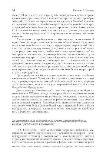 На основе ретроспективного анализа в работе выявлены принципиальные расхождения основных положений аграрных реформ А. В. Чаянова и П. А. Столыпина по критериям: основной хозяйствующий субъект сельской экономики, цель хозяйствования, формы организации труда, формы собственности/пользования на землю, оценка выгодности ведения хозяйства и ряд других.