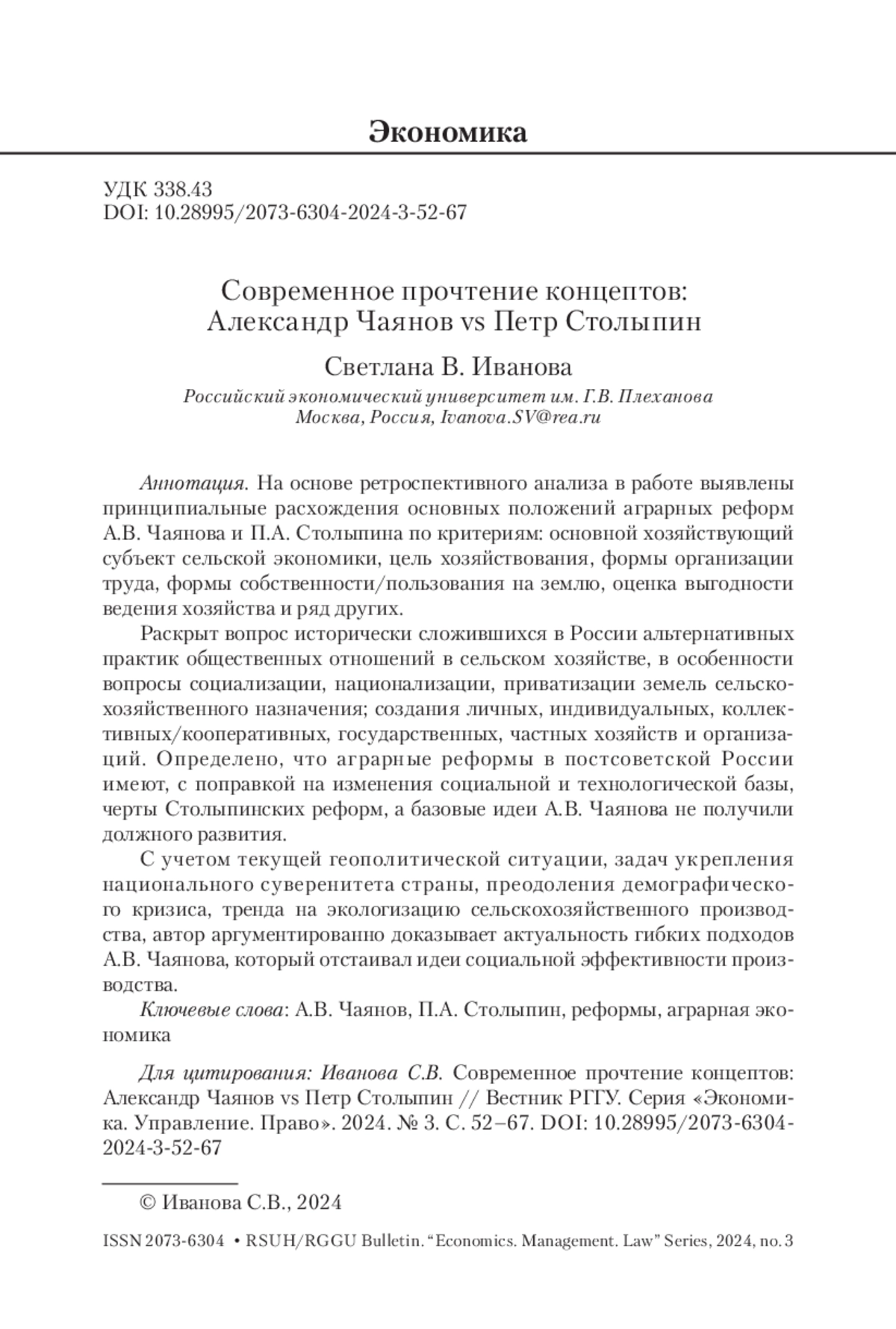 С учетом текущей геополитической ситуации, задач укрепления национального суверенитета страны, преодоления демографического кризиса, тренда на экологизацию сельскохозяйственного производства, автор аргументированно доказывает актуальность гибких подходов А. В. Чаянова, который отстаивал идеи социальной эффективности производства.
