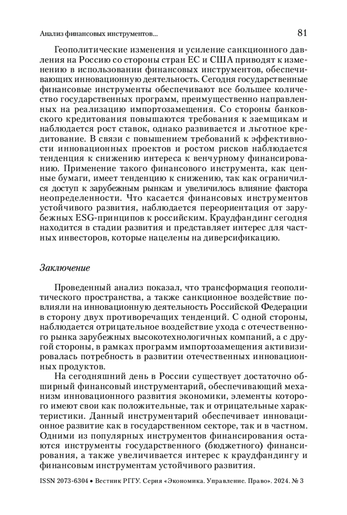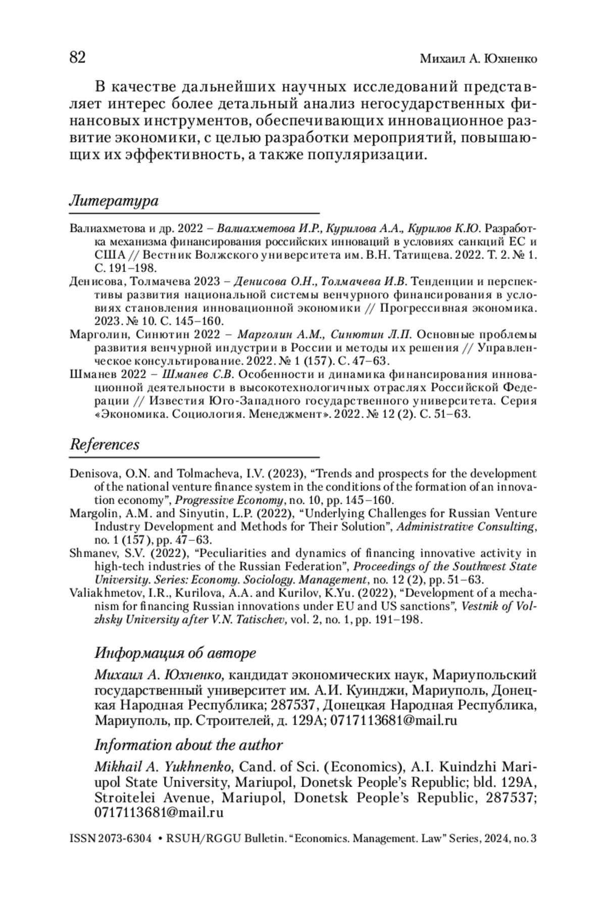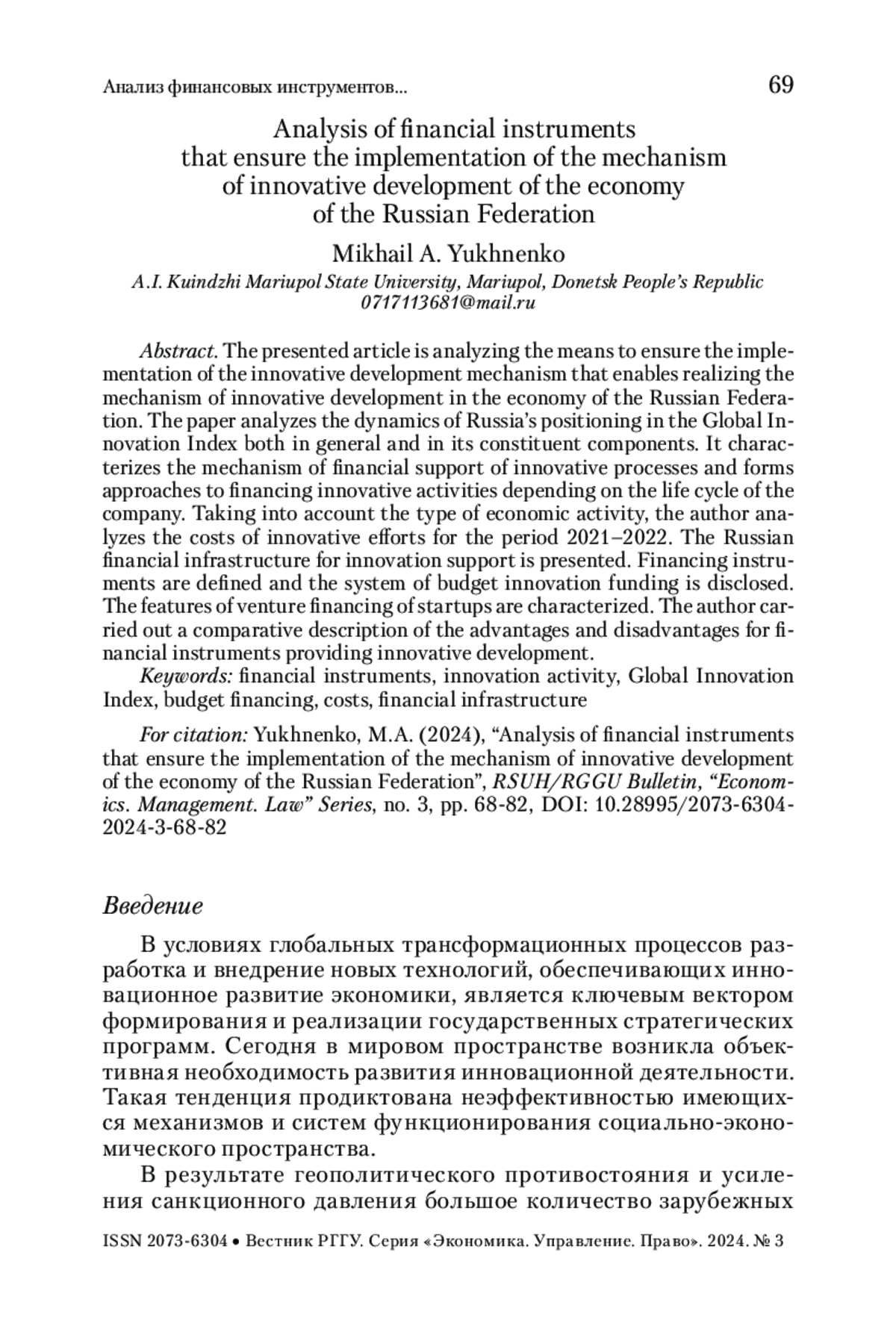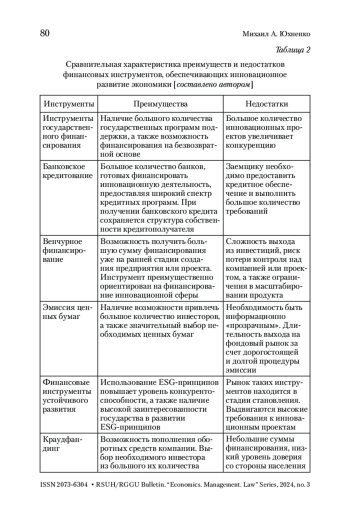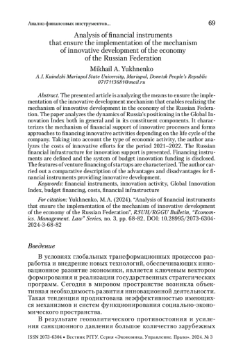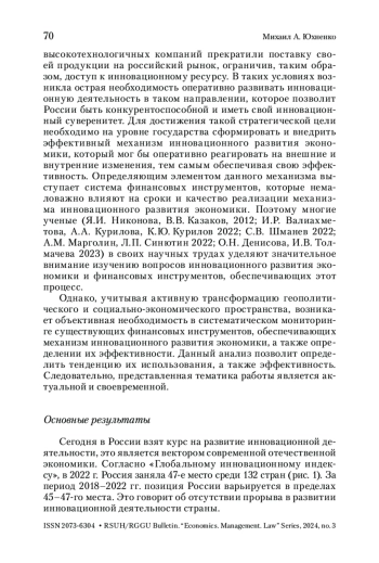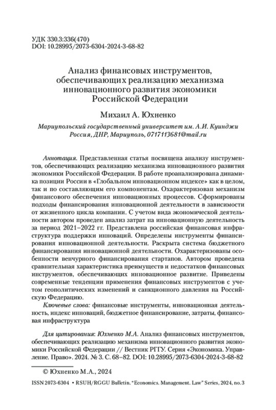 ЮХНЕНКО М. А. АНАЛИЗ ФИНАНСОВЫХ ИНСТРУМЕНТОВ, ОБЕСПЕЧИВАЮЩИХ РЕАЛИЗАЦИЮ МЕХАНИЗМА ИННОВАЦИОННОГО РАЗВИТИЯ ЭКОНОМИКИ РОССИЙСКОЙ ФЕДЕРАЦИИ // ВЕСТНИК РГГУ. СЕРИЯ: ЭКОНОМИКА. УПРАВЛЕНИЕ. ПРАВО. 2025. № 3