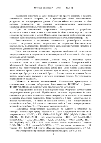 3. Kinfe B., Feyssa T., Bedada G. In Vitro Micropropagation of Grape Vine (Vitis Vinifera L.) From Nodal Culture // African Journal of Biotechnology. 2017. Vol. 16(43). P. 2083–2091.