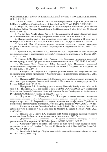 17. Дорошенко Н.П., Пузырнова В.Г. Создание коллекции винограда in vitro: рекомендации. Новочеркасск: ВНИИВиВ ‒ филиал ФГБНУ ФРАНЦ, 2022. 33 с.