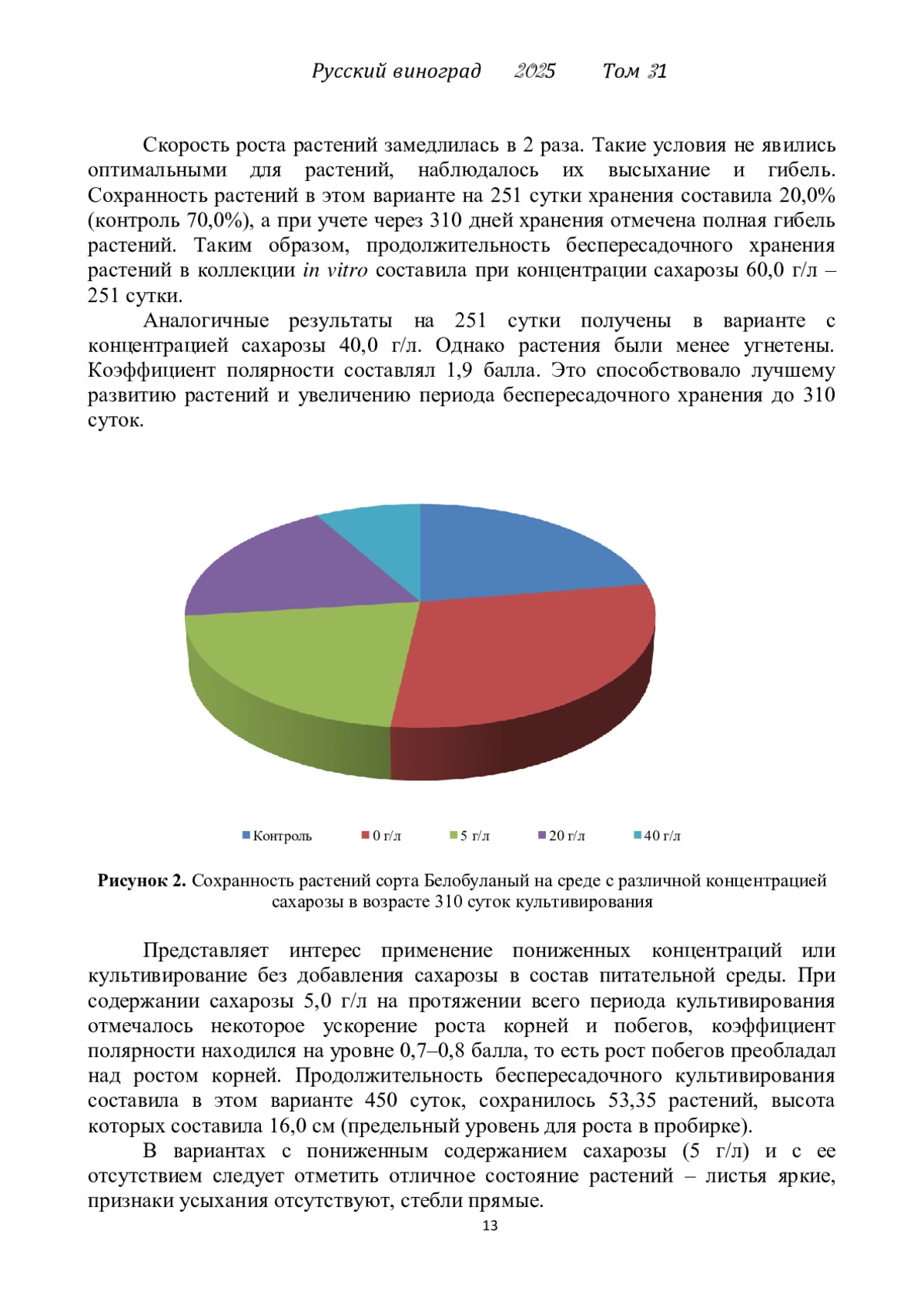 В статье представлены результаты исследований Всероссийского НИИ виноградарства и виноделия имени Я. И. Потапенко по созданию протокола микроразмножения и сохранения в коллекции in vitro автохтонного донского сорта винограда Белобуланый. Исследования в области культуры in vitro проведены по общепринятым в биотехнологии методикам. Впервые для сорта Белобуланый изучено влияние места извлечения микрочеренка из пробирочного растения на скорость ростовых процессов и сохранность. Исследованы морфологические характеристики и сохранность растений в коллекции in vitro при культивировании на питательной среде с различными концентрациями сахарозы и полным ее отсутствием. Сахароза меняет осмотические характеристики культуральных сред и оказывает влияние на скорость роста растений. Определены концентрации сахарозы оптимальные для депонирования растений и для массового тиражирования.
