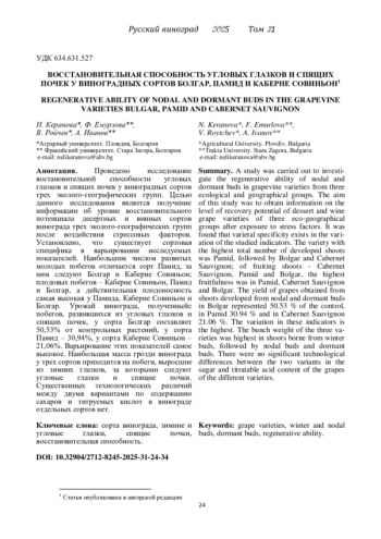 КЕРАНОВА Н., ЕМУРЛОВА Ф., РОЙЧЕВ В., ИВАНОВ А. ВОССТАНОВИТЕЛЬНАЯ СПОСОБНОСТЬ УГЛОВЫХ ГЛАЗКОВ И СПЯЩИХ ПОЧЕК У ВИНОГРАДНЫХ СОРТОВ БОЛГАР, ПАМИД И КАБЕРНЕ СОВИНЬОН // РУССКИЙ ВИНОГРАД. 2025. № 31