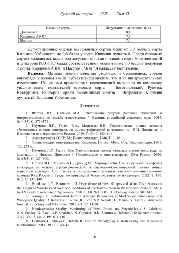 5. Наумова Л.Г., Ганич В.А. Увологическая оценка столовых сортов винограда на коллекции в Нижнем Придонье // Плодоводство и виноградарство Юга России. 2020. № 65(5). С. 127–140.