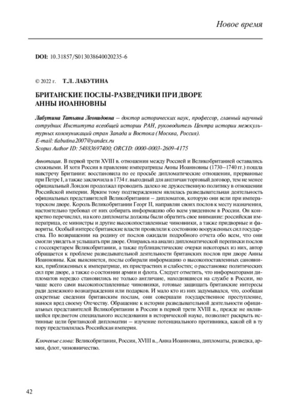 6. Лабутина Т.Л. Великобритания и Россия на пути к восстановлению дипломатических отношений (1720-1731 годы) // Новая и новейшая история. 2021. № 4. С. 59-70. EDN: TBZNLI