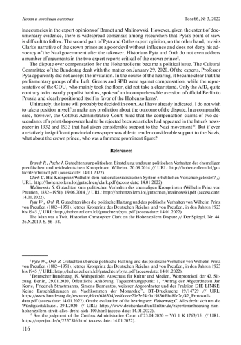 1. Brandt P., Pache J. Gutachten zur politischen Einstellung und zum politischen Verhalten des ehemaligen preußischen und reichsdeutschen Kronprinzen Wilhelm. 20.08.2014 // URL: http://hohenzollern.lol/gutachten/brandt.pdf (access date: 14.01.2022).