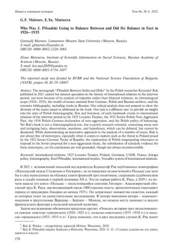 5. Матвеева Е.Ю., Матвеев Г.Ф. Советский Союз и подготовка Локарнских соглашений 1925 года (по материалам советских официозов “Известия” и “Правда”) // Polska i Niemcy. Od odzyskania niepodległosci do Rapallo i Lokarno 1918/1922-1926/1934. Warszawa, 2020. S. 51-70.