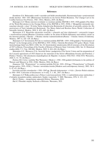 4. Матвеев Г.Ф. “Советизация Польши” во внешней политике РСФСР в 1919-1920 годах // Столетие Революции 1917 года в России. Труды исторического факультета МГУ. Сер. II. Исторические исследования. Т. 1. Вып. 108. (60). М., 2019. С. 414-428.