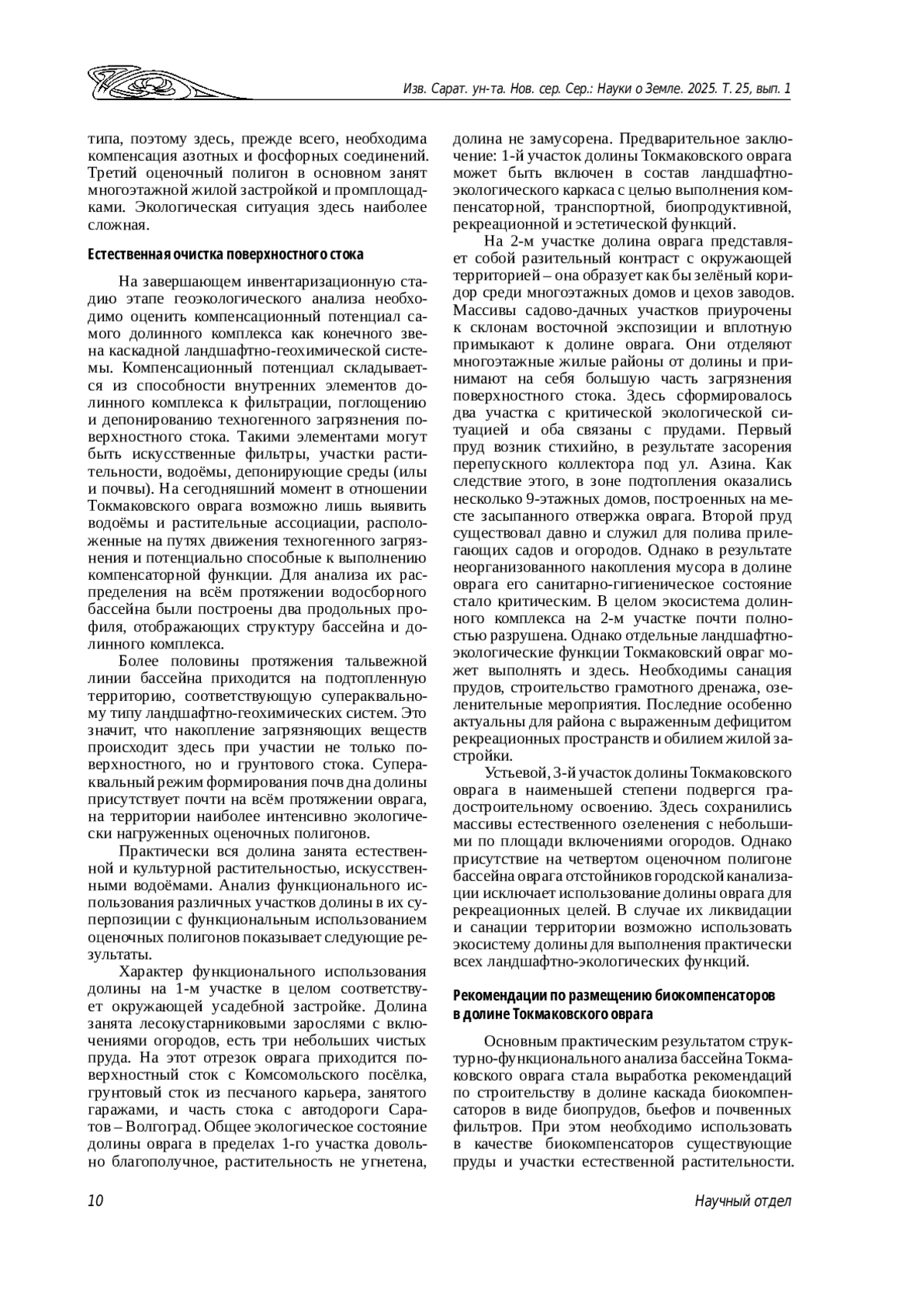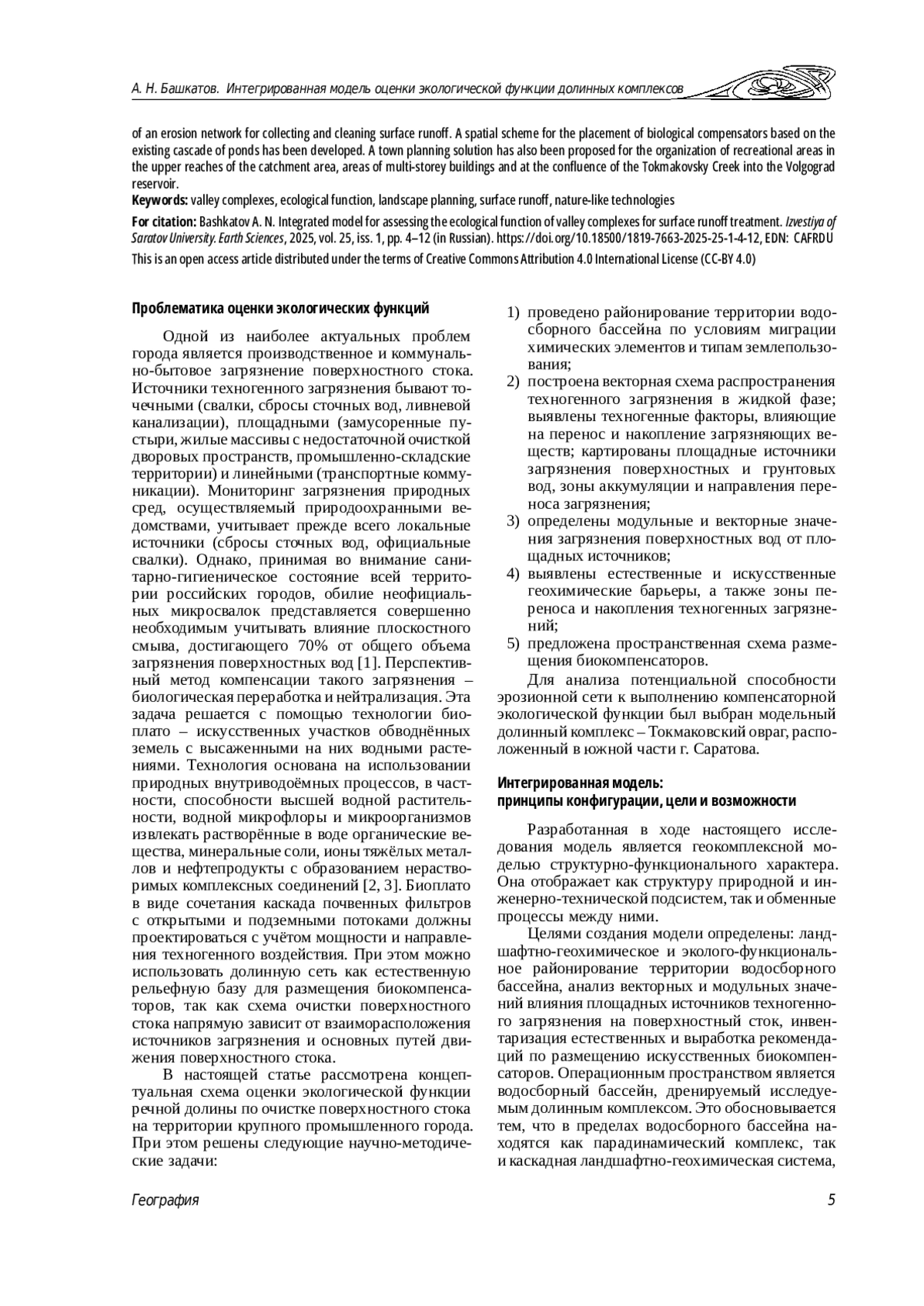 Рассматриваются методологические аспекты оценки городской территории на основе интеграции бассейновой, векторной, ландшафтно-геохимической и эколого-функциональной моделей. В качестве объекта исследования был выбран Токмаковский овраг, расположенный на южной окраине г. Саратова. Долина оврага представляет собой типичный элемент ландшафтной структуры Приволжской возвышенности и сохранила традиционные формы природопользования. Проведённый структурно-функциональный анализ модельного долинного комплекса показывает возможность использования свойств эрозионной сети для сбора и очистки поверхностного стока. Разработана пространственная схема размещения биологических компенсаторов на основе существующего каскада прудов. Также предложено градопланировочное решение по организации рекреационных зон в верховьях водосборного бассейна, районах многоэтажной застройки и в месте впадения русла Токмаковского ручья в Волгоградское водохранилище.