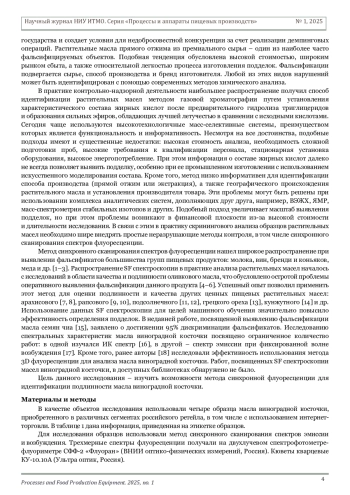 18. Васильев В.А., Реснянская А.С. Использование 3D-спектров флуоресценции для идентификации подлинности масла виноградной косточки // Научный журнал НИУ ИТМО. Серия: Процессы и аппараты пищевых производств. 2024. № 3. С. 10-17.