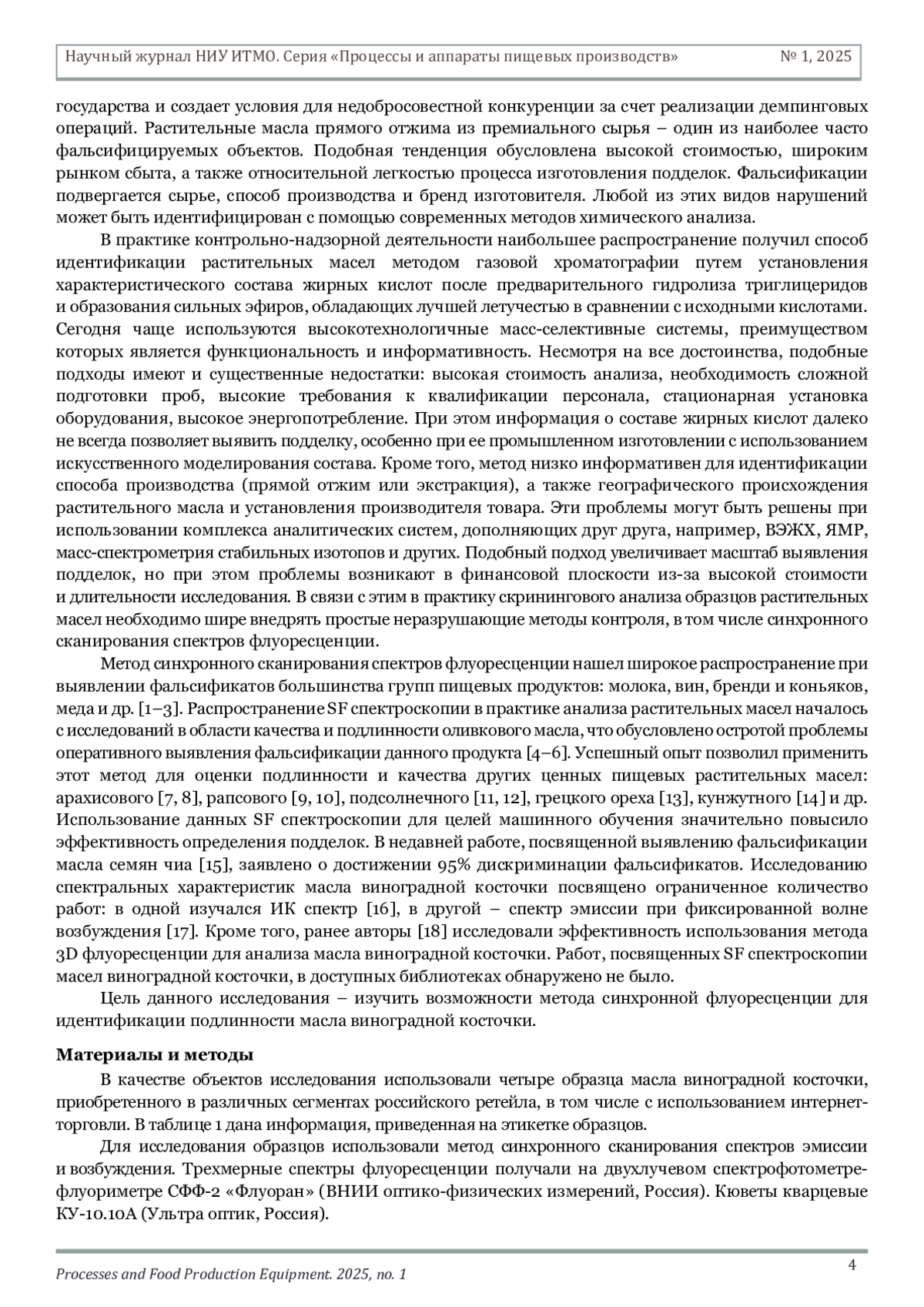 14. Wu X., Zhao Z., Tian R., Gao S., Niu Yu., Liu H. Exploration of total synchronous fluorescence spectroscopy combined with pre-trained convolutional neural network in the identification and quantification of vegetable oil. Food Chem. 2021, V. 335, article 127640. DOI: 10.1016/j.foodchem.2020.127640