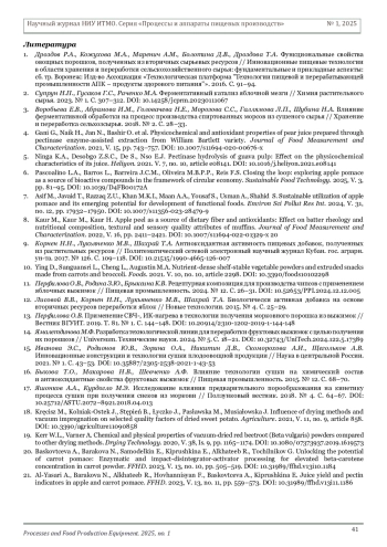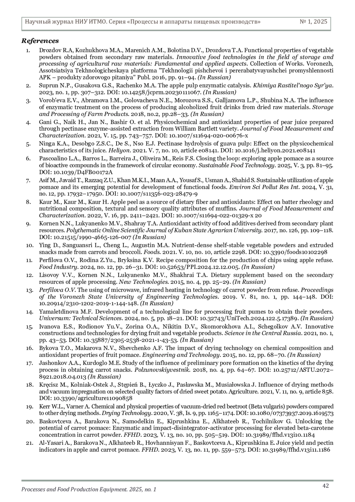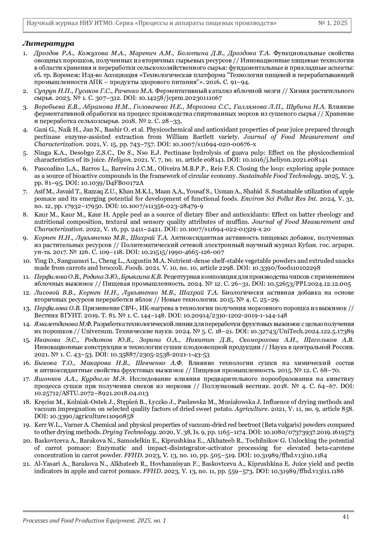 11. Перфилова О.В., Родина З.Ю., Брыксина К.В. Рецептурная композиция для производства чипсов с применением яблочных выжимок // Пищевая промышленность. 2024. № 12. С. 26-31. DOI: 10.52653/PPI.2024.12.12.005
