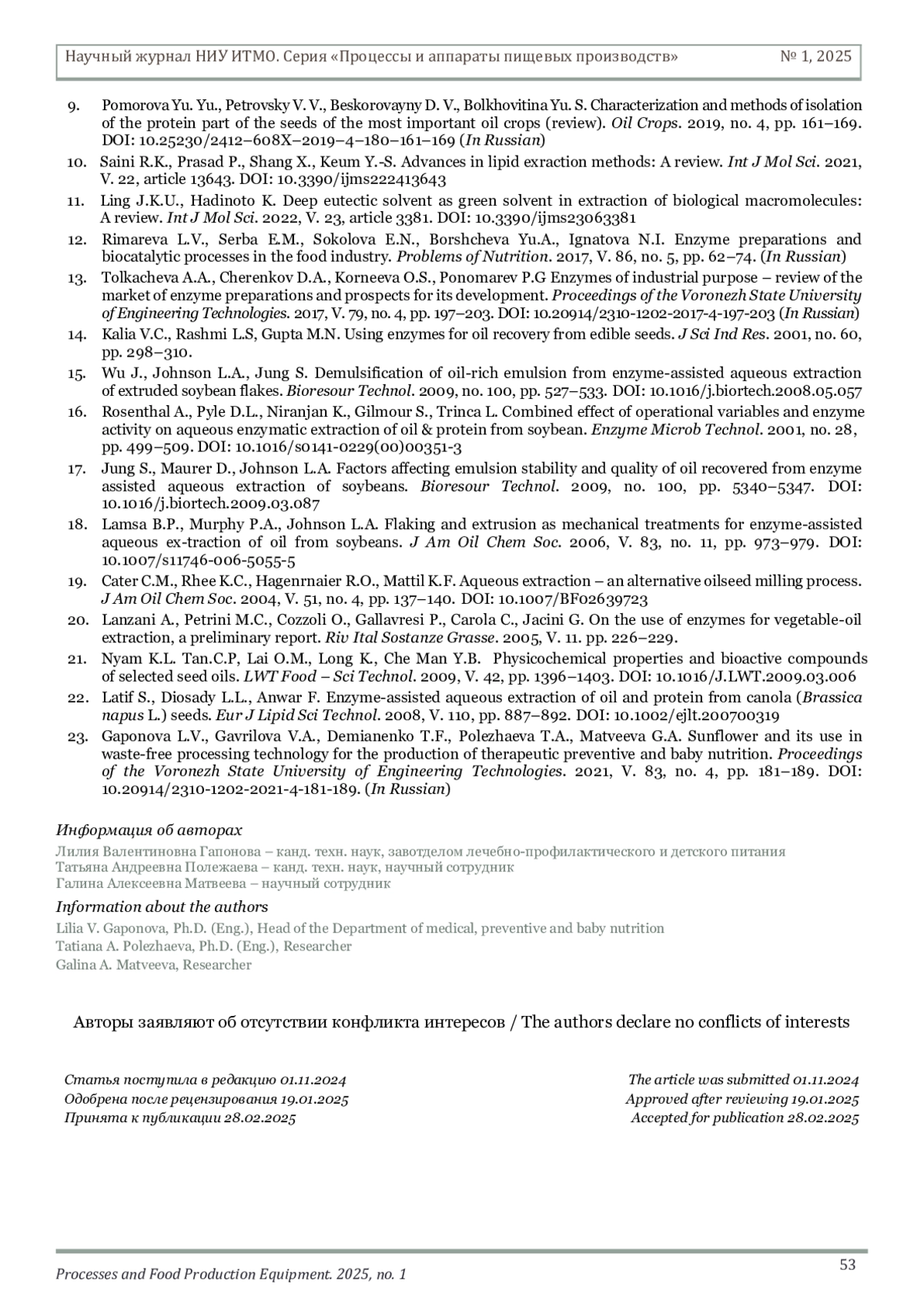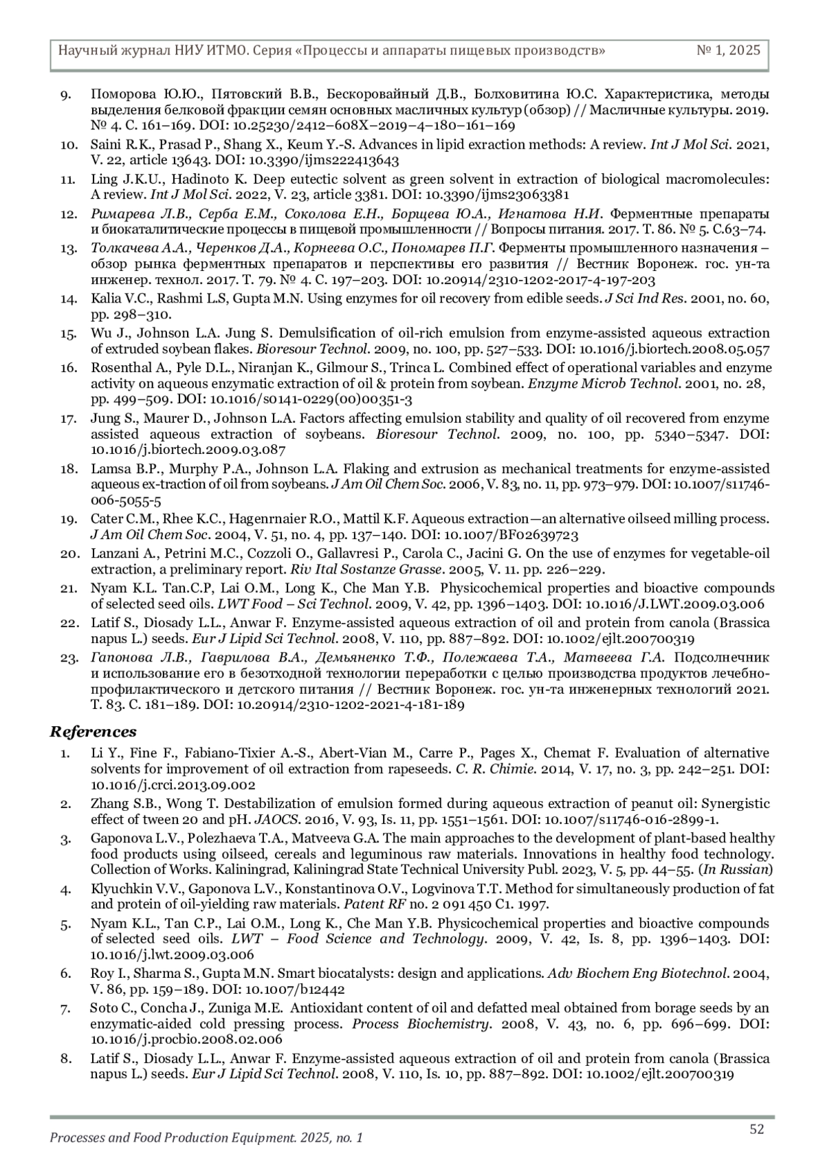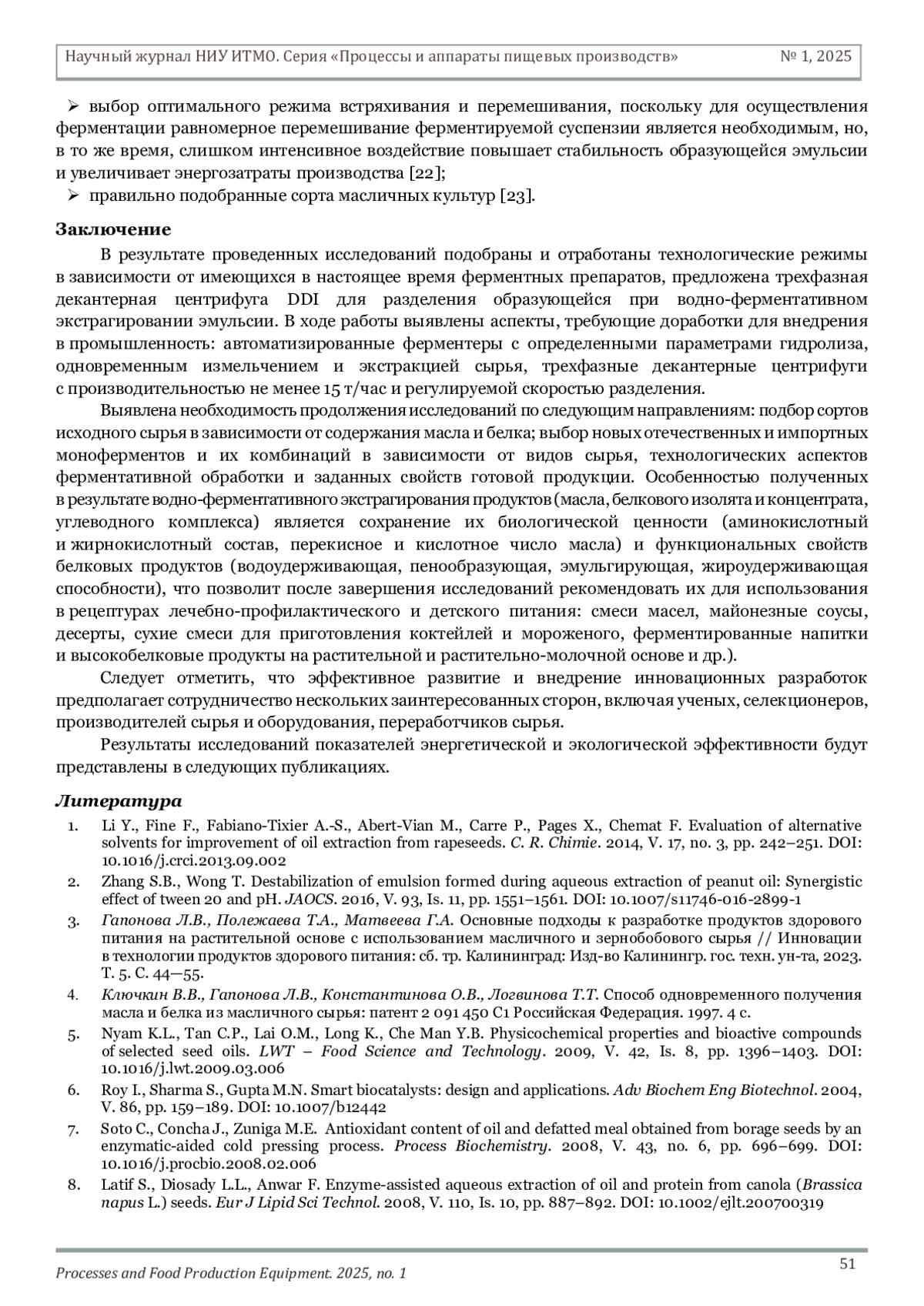ГАПОНОВА Л. В., ПОЛЕЖАЕВА Т. А., МАТВЕЕВА Г. А. ОСОБЕННОСТИ ФЕРМЕНТАТИВНОЙ ОБРАБОТКИ МАСЛИЧНОГО СЫРЬЯ С ЦЕЛЬЮ ВЫДЕЛЕНИЯ БЕЛКА И ЛИПИДОВ ДЛЯ ИСПОЛЬЗОВАНИЯ В ПИЩЕВЫХ ПРОДУКТАХ СПЕЦИАЛИЗИРОВАННОГО И ДЕТСКОГО ПИТАНИЯ // НАУЧНЫЙ ЖУРНАЛ НИУ ИТМО. СЕРИЯ: ПРОЦЕССЫ И АППАРАТЫ ПИЩЕВЫХ ПРОИЗВОДСТВ. 2025. № 1 (63)