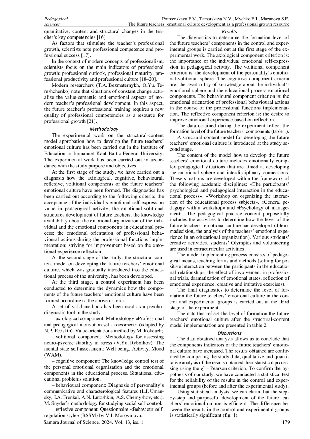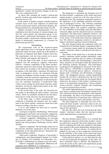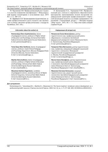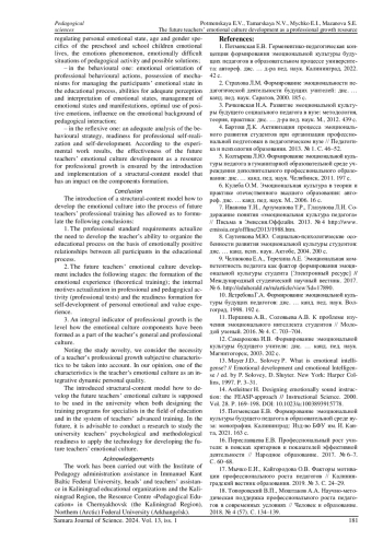 1. Потменская Е.В. Герменевтико-педагогическая концепция формирования эмоциональной культуры будущих педагогов в образовательном процессе университета: автореф. дис. … д-ра пед. наук. Калининград, 2022. 42 с. EDN: OJTCLM