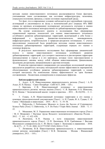 Существующие подходы к оценке инвестиционного потенциала часто не учитывают сложные взаимосвязи между городом и его окрестностями. Большинство методик сосредоточено на анализе совокупности блоков факторов, таких как инфраструктура, экономика, социальное положение и экология, однако этого недостаточно для всесторонней оценки инвестиционной привлекательности. Учитывая, что крупные городские агломерации формируют около 48 % валового внутреннего продукта страны, необходимо уделить особое внимание инвестиционному потенциалу именно урбанизированных территорий. В процессе всестороннего анализа был разработан ограниченный набор показателей для оценки инвестиционного потенциала их устойчивого развития, включающий трудовой, финансово-экономический, инновационный, инфраструктурный, потребительский и природно-ресурсный потенциалы. На основе этих показателей была создана методология оценки, которая содержит порядок анализа и ключевые формулы для вычислений, разработанные на основе теории оптимального проектирования. Предложен динамический подход к оценке инвестиционного потенциала, который учитывает не только сам город, но и его пригород, взаимосвязанные общими потоками материальных и нематериальных ресурсов, а также инвестиций. В качестве направления для будущих исследований автор предлагает разработать методику интегральной оценки эффективности мероприятий по устойчивому развитию урбанизированных территорий. Она должна основываться на комплексном анализе бюджетного, коммерческого и социального эффектов, что позволит более точно определить влияние различных факторов на инвестиционный климат и обеспечить сбалансированное развитие как городских, так и пригородных территорий.