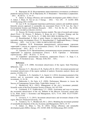 8. Вертакова, Ю. В. Моделирование инвестиционного потенциала устойчивого развития города [Текст] / Ю. В. Вертакова, М. Л. Мошкевич // Экономика и управление. – 2011. – № 10(72). – С. 34–37.