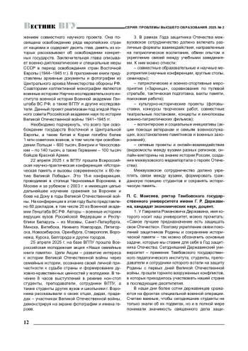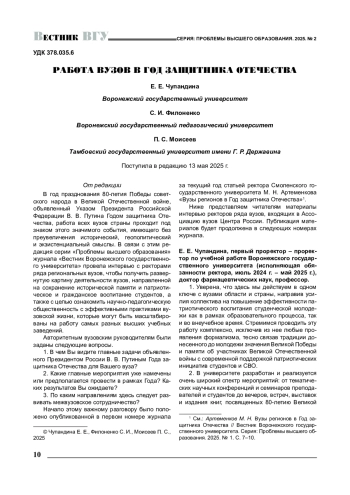 В год празднования 80-летия Победы советского народа в Великой Отечественной войне, объявленный Указом Президента Российской Федерации В. В. Путина Годом защитника Отечества, работа всех вузов страны проходит под знаком этого значимого события, имеющего без преувеличения исторический, геополитический и экзистенциальный смыслы. В связи с этим редакция серии «Проблемы высшего образования» журнала «Вестник Воронежского государственного университета» провела интервью с ректорами ряда региональных вузов, чтобы получить развернутую картину деятельности вузов, направленной на сохранение исторической памяти и патриотическое и гражданское воспитание студентов, а также с целью ознакомить научно-педагогическую общественность с эффективными практиками вузовской жизни, которые могут быть масштабированы на работу самых разных высших учебных заведений.