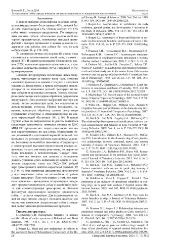 16. Branson N.J., Rogers L.J. Relationship between paw preference strength and noise phobia in Canis familiaris // Journal of Comparative Psychology. 2006. Vol. 120 (3). P. 176-183. DOI: 10.1037/0735-7036.120.3.176