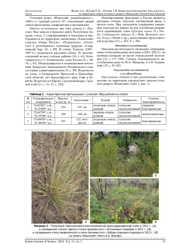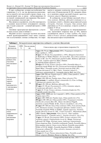 В статье представлены сведения о ценопопуляциях Stipa pennata на территории рекультивированного отвала угольного разреза «Изыхский». Статус вида на территории Республики Хакасия - сокращающийся в численности вид. Приведен анализ геоботанических описаний с участием Stipa pennata. Вид обнаружен в составе частично восстановленной крупнодерновинной ковыльной степи, насаждений тополя черного и вяза приземистого с мятликовым покровом, насаждений клена американского и вяза приземистого с бобово-злаковым покровом. Учет местонахождений этого вида затруднен в связи с нерегулярностью его цветения. Численность вида на первом участке наибольшая. Stipa pennata произрастает совместно со злаками-содоминантами: для участков более увлажненных - Poa pratensis, Calamagrostis epigeios, для более сухих - Stipa capillata, Poa angustifolia, Festuca valesiaca. Вид в условиях отвалов способен произрастать на ровных степных, лугово-степных участках и лесных насаждениях, причем в последних с меньшим обилием из-за конкуренции других видов растений и недостатка света. На открытых участках вид способен доминировать в фитоценозах. В статье представлены рекомендации по сохранению, реинтродукции и мониторингу редких видов на территории отвалов угольных разрезов Республики Хакасии.