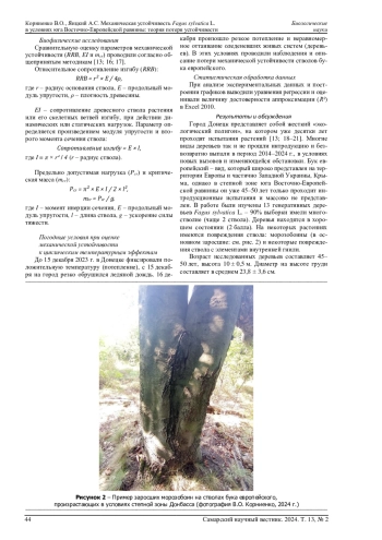 21. Корниенко В.О., Калаев В.Н. Влияние природно-климатических факторов на механическую устойчивость и аварийность деревьев березы повислой в г. Донецке // Лесоведение. 2022. № 3. С. 321-334. EDN: KDUHDW