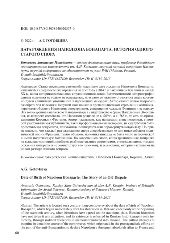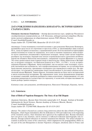 Статья посвящена столетней полемике о дате рождения Наполеона Бонапарта, начавшейся сразу после его отречения от престола в 1814 г. и закончившейся лишь в начале XX в., когда историки согласились с традиционной датой. В отечественной историографии данная полемика не только не освещалась, но и само ее наличие отражалось лишь косвенно путем единичных упоминаний в переводных мемуарах. Автор ставит целью подробно разобрать ход полемики, берущей свое начало в пропагандистском стремлении антибонапартистов объявить Наполеона иностранцем, совершенно чуждым Франции и ее народу. Эта точка зрения нашла свою главную опору в свидетельстве о браке Наполеона и Жозефины, из которого следовало, что Наполеон родился не в 1769 г., а в 1768 г., то есть до присоединения Корсики к Франции. Автор показывает, как на каждом этапе полемики, в которой участвовали как публицисты, так и профессиональные историки, на суд публики были представлены документы, призванные подтвердить или опровергнуть новую дату. Но примечательно, что каждый раз оживлению спора способствовали те или иные события политической жизни Франции. Таким образом, полемика никогда не была чисто исторической и имела политическую мотивацию. На современном этапе, когда традиционная датировка не вызывает сомнений, проблема разбирается лишь астрологами, утверждающими, что дата рождения императора не соответствует его гороскопу, и эссеистами, которые настаивают на новом разборе данного вопроса