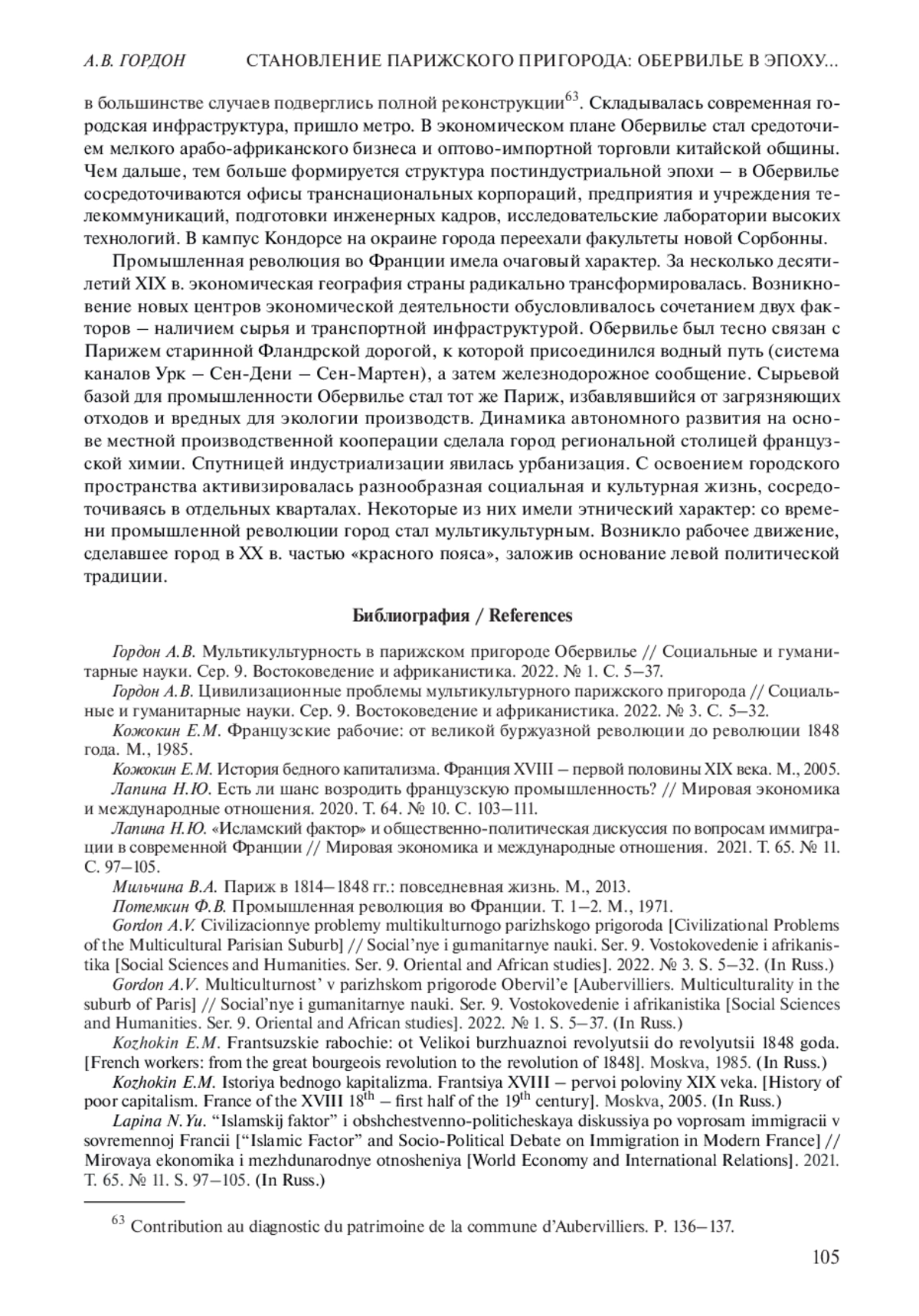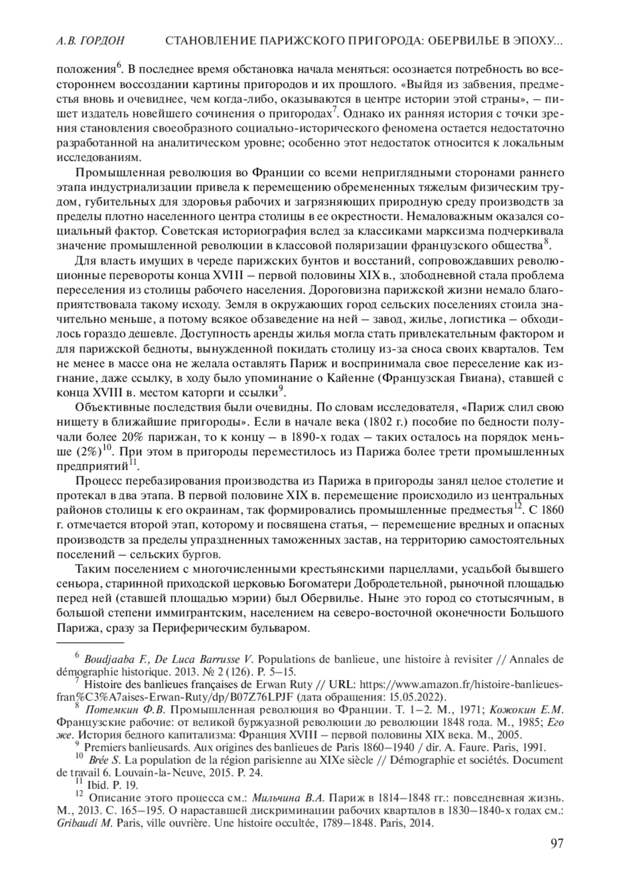 ГОРДОН А. В. СТАНОВЛЕНИЕ ПАРИЖСКОГО ПРИГОРОДА: ОБЕРВИЛЬЕ В ЭПОХУ ПРОМЫШЛЕННОЙ РЕВОЛЮЦИИ // НОВАЯ И НОВЕЙШАЯ ИСТОРИЯ. 2022. № 6