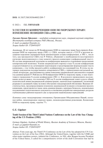 40 лет назад на III Конференции ООН по морскому праву была принята Конвенция ООН по морскому праву (1982 г.). США, которые вместе с СССР и другими ведущими морскими державами были инициаторами созыва конференции, в 1981 г., после того, как президентом США стал Р. Рейган, объявляют о необходимости всестороннего изучения подготовленного к тому моменту проекта конвенции («неформальный текст»). Из состава американской делегации на конференции выводятся сторонники продолжения компромиссной политики. Усилия американской стороны в ходе X сессии конференции сосредоточиваются на затягивании переговоров и предотвращении формализации текста конвенции, с тем чтобы продлить работу конференции на следующий год. В статье на материале документов государственного департамента США, с привлечением актуальной научной литературы, рассматривается линия поведения американской дипломатии в первый год администрации Р. Рейгана на III Конференции ООН по морскому праву, в ходе подготовки и проведения X сессии конференции (1981 г.). В результате проведенного исследования делается вывод, что политика США на X сессии конференции лежит в русле общей политической линии американской администрации, окончательно порвавшей с политикой разрядки и сделавшей ставку на новое обострение международной обстановки. Важным обстоятельством, предопределившим изменение американской позиции в отношении проекта конвенции, представляется также связь администрации с крупным бизнесом, недовольным положениями подготовленного документа в отношении разработки минеральных ресурсов глубоководных районов морского дна за пределами национальных юрисдикций