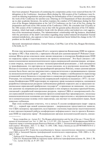 В этом году исполнилось ровно 40 лет с момента принятия Конвенции ООН по морскому праву в 1982 г. Как известно, с приходом в Белый дом администрации Р. Рейгана Соединенные Штаты резко изменили свою линию поведения в отношении Конференции ООН по морскому праву и подготовленного ею проекта конвенции1. Это было связано с общими изменениями внешнеполитического курса американской администрации, которые, в свою очередь, вытекали из логики «неоконсервативной революции», с ней связывается та трансформация, что претерпела не только внешняя, но и внутренняя политика США. Исходя из основных постулатов предвыборной программы Рейгана, новая администрация должна была более жестко противостоять социалистическим и развивающимся странам на внешнеполитической арене2, кроме того, Рейган говорил о необходимости пересмотра отношений между бизнесом и государством и снижения регулирующей роли государства 3. Учитывая, что основное недовольство американской стороны на ведшихся с 1973 г. на площадке Конференции ООН переговорах по морскому праву вызывали вопросы, касавшиеся разработки минеральных ресурсов глубоководных районов морского дна за пределами национальных юрисдикций прибрежных государств 4, и принимая во внимание, что основное давление на американскую администрацию в этих вопросах оказывал крупный бизнес, связанный с разработкой минеральных ресурсов, переход США от компромиссной к более агрессивной политике в отношении проекта конвенции был предопределен, поскольку внешнеполитические основания для такого перехода переплетались с внутриполитическими и концептуальные основы этого пересмотра, как явствует из написанного выше, были довольно глубокими.