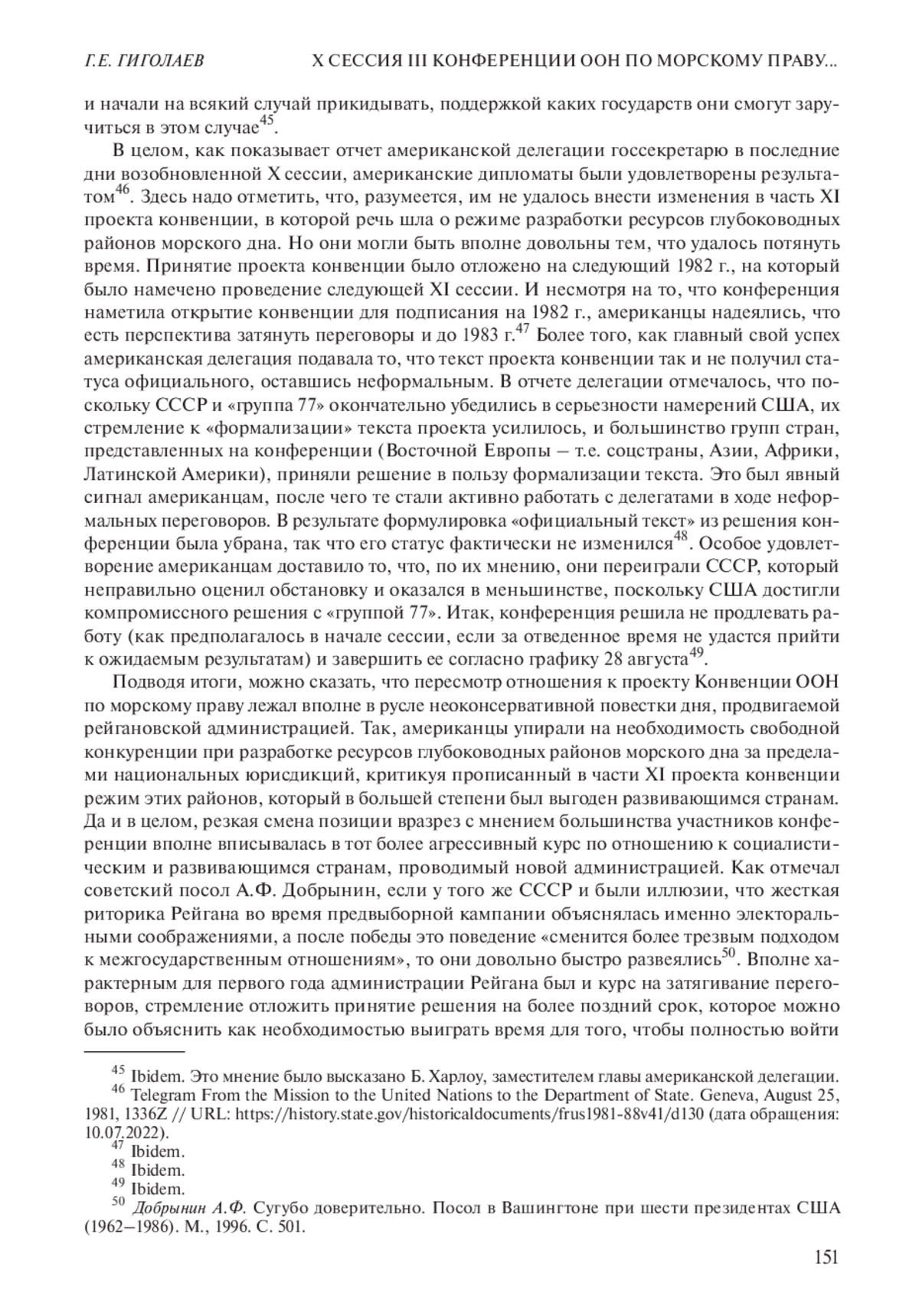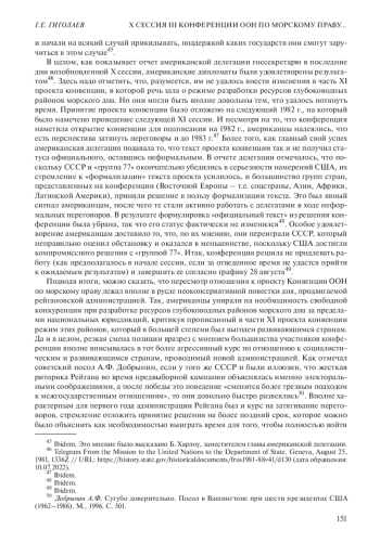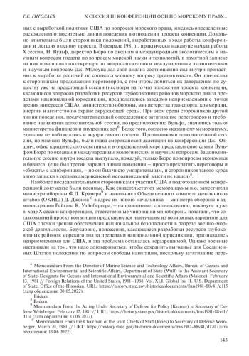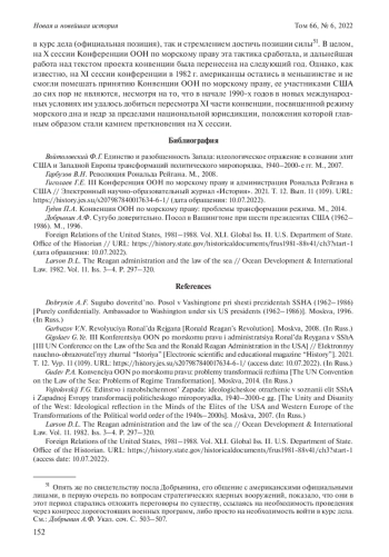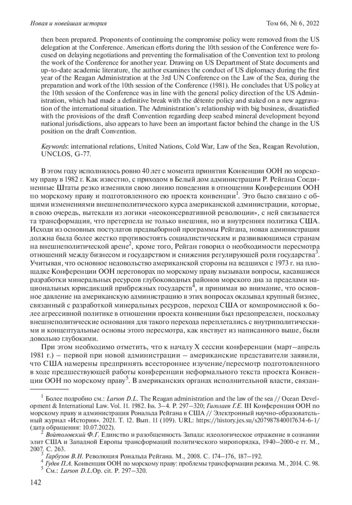 3. Гиголаев Г.Е. III Конференция ООН по морскому праву и администрация Рональда Рейгана в США // Электронный научно-образовательный журнал “История”. 2021. T. 12. Вып. 11 (109). URL: https://history.jes.su/s207987840017634-6-1/ (дата обращения: 10.07.2022). EDN: QIAQPQ