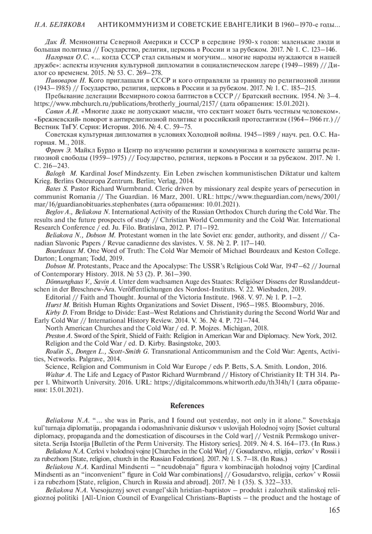 16. Beglov A., Beliakova N. International Activity of the Russian Orthodox Church during the Cold War. The results and the future prospects of study // Christian World Community and the Cold War. International Research Conference / ed. Ju. Filo. Bratislava, 2012. P. 171-192.