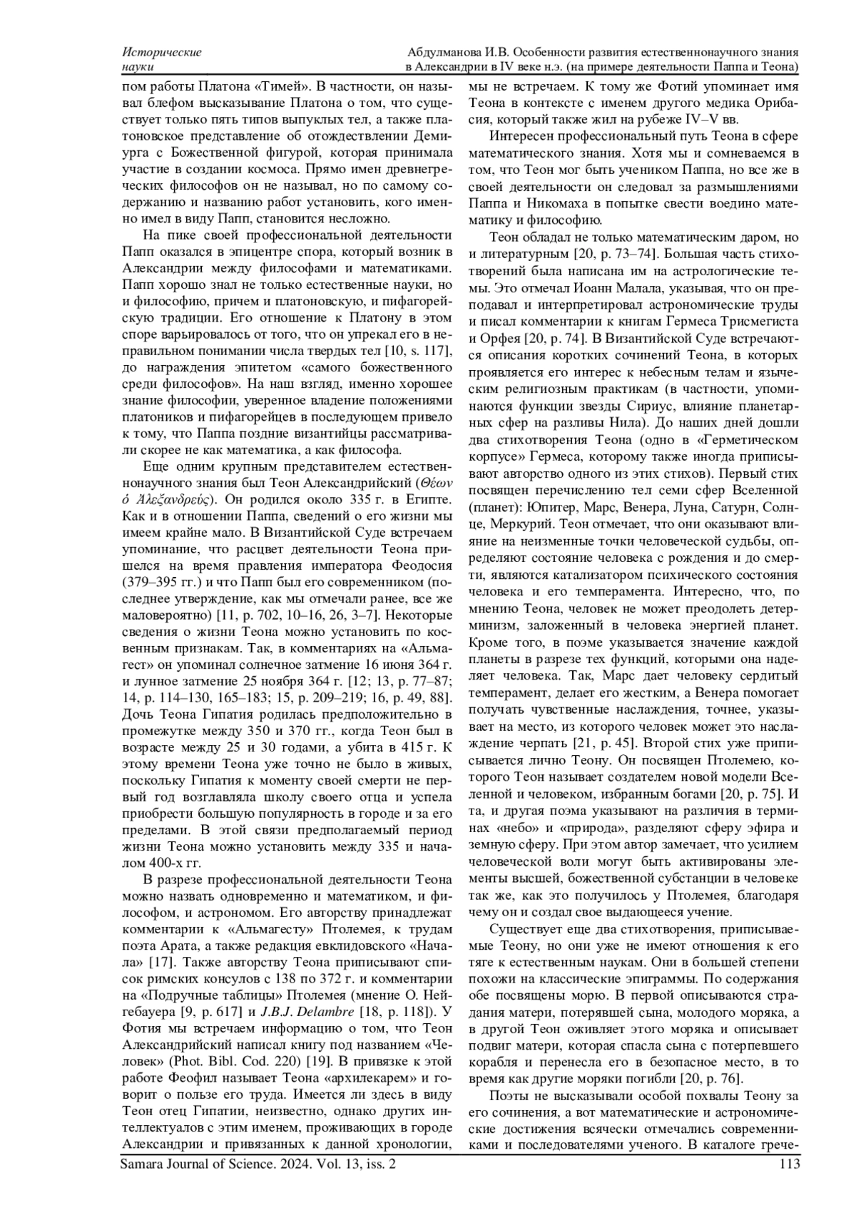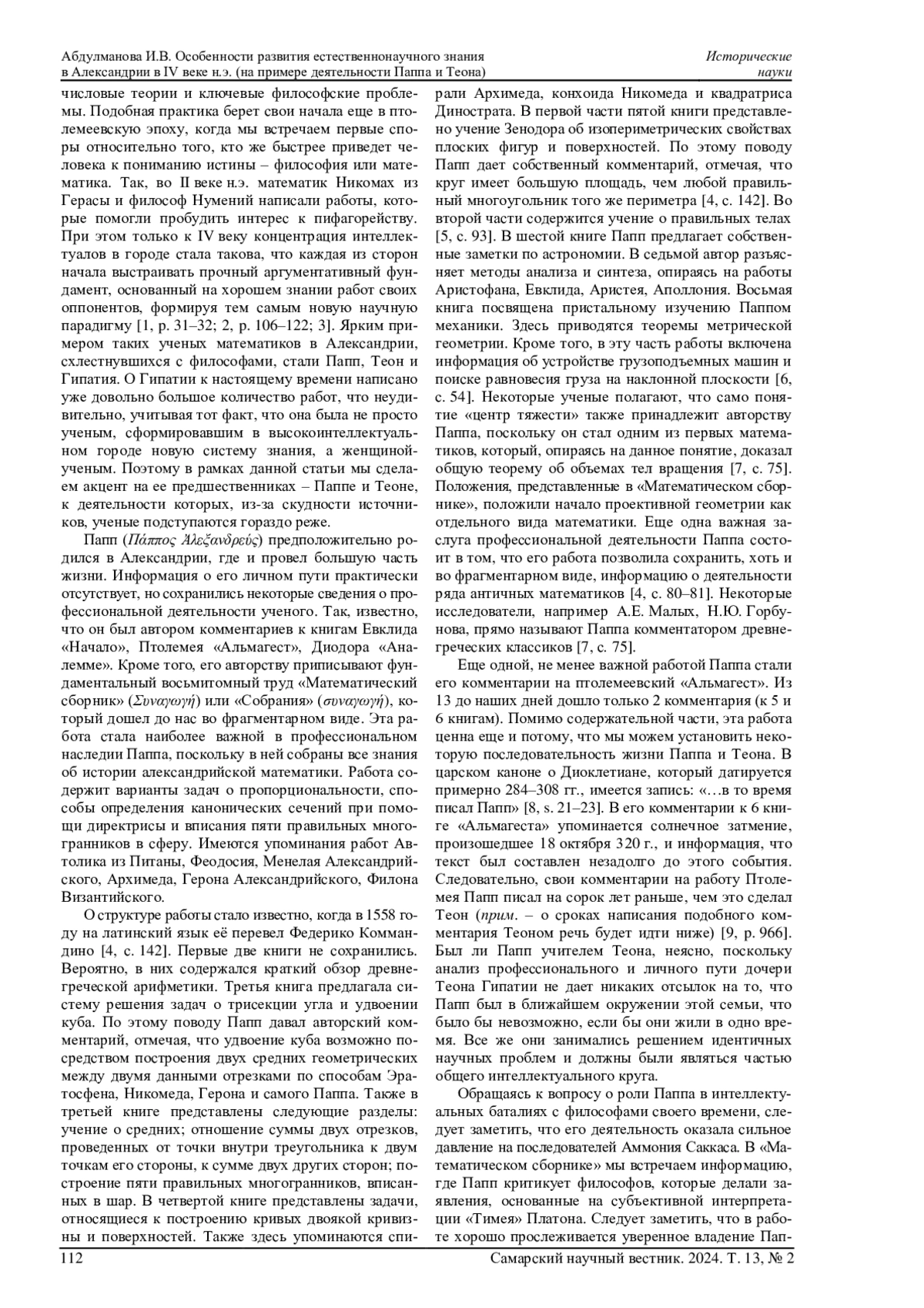 Статья посвящена анализу личного и профессионального пути выдающихся александрийских интеллектуалов Паппа и Теона. В работе исследуются основные труды ученых и их научные достижения в сфере естественнонаучного знания, а также привязка интеллектуального наследия Паппа и Теона к развернувшейся в IV веке в Александрии конфронтации между светскими интеллектуалами и христианами. В статье приводятся доказательства того, что Папп и Теон продолжили развивать естественнонаучное знание в Александрии в ситуации, когда христианская власть усилилась настолько, что любые попытки обращения к языческому наследию ставили под сомнение само существование подобной школы в городе. Автор статьи проводит идею о том, что деятельность этих ученых стала одной из причин последующей конфронтации в научной среде города между язычниками и христианами. Параллельно автор утверждает, что Папп и впоследствии Теон предприняли попытку соединить математику и философию, сформировав в Александрии новый пласт ученых в лице дочери Теона Гипатии и её учеников, которые сделали философию не умозрительной, теоретической наукой, а выделили её практические стороны.