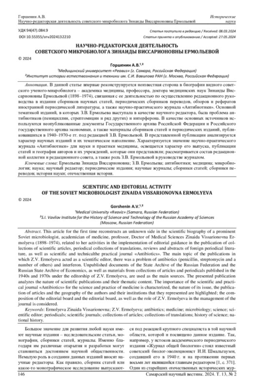 7. Горшенин А.В. История научно-практической деятельности советского микробиолога З.В. Ермольевой по изучению и применению антибактериальных агентов в 1930-е гг.: монография. Самара: Инсома-пресс, 2022. 224 с.