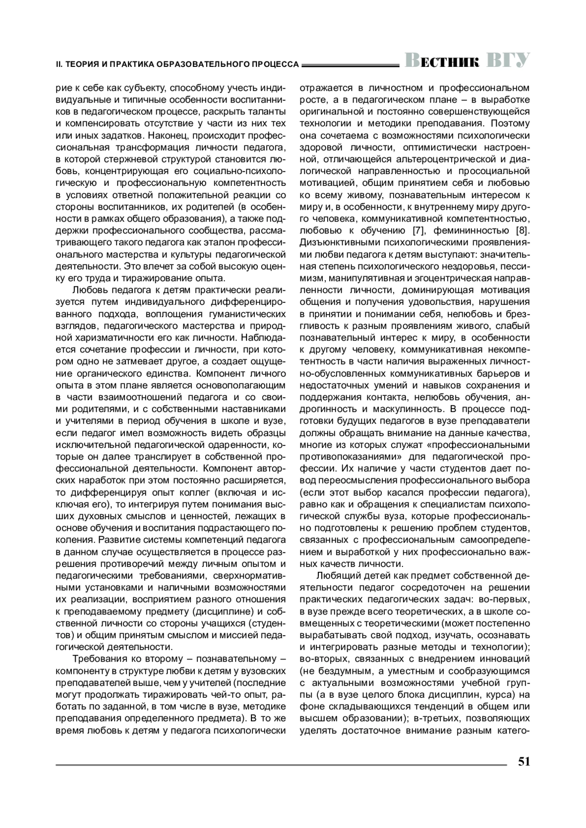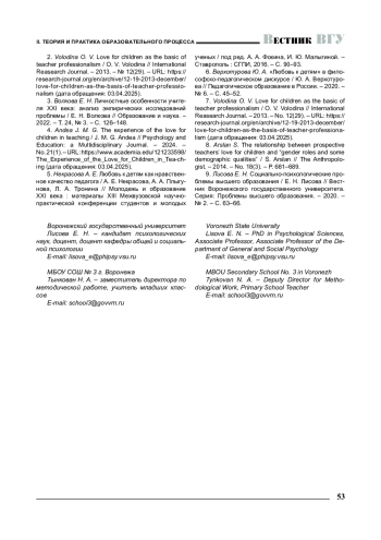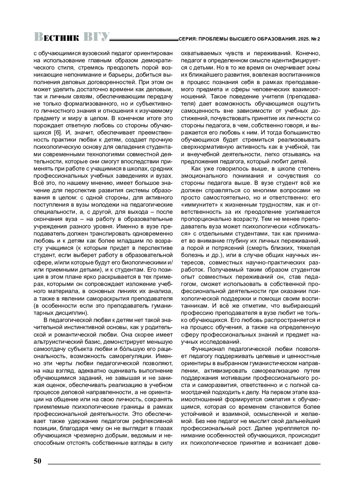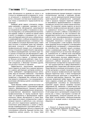 ЛИСОВА Е. Н., ТЫНКОВАН Н.А. ЛЮБОВЬ К ДЕТЯМ КАК ПСИХОЛОГИЧЕСКИЙ ФЕНОМЕН И АКСИОЛОГИЧЕСКИЙ ФОКУС ПОДГОТОВКИ ПЕДАГОГОВ В ВУЗЕ // ВЕСТНИК ВОРОНЕЖСКОГО ГОСУДАРСТВЕННОГО УНИВЕРСИТЕТА. СЕРИЯ: ПРОБЛЕМЫ ВЫСШЕГО ОБРАЗОВАНИЯ. 2025. № 2