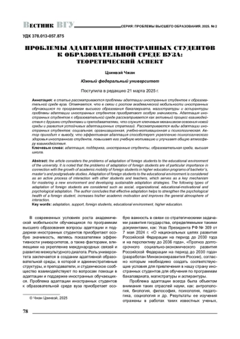 В статье рассматриваются проблемы адаптации иностранных студентов к образовательной среде вуза. Отмечается, что в связи с ростом академической мобильности иностранных обучающихся по программам высшего образования бакалавриата, магистратуры и аспирантуры проблемы адаптации иностранных студентов приобретают особую значимость. Адаптация иностранных студентов к образовательной среде рассматривается как активный процесс взаимодействия с другими студентами и преподавателями, что служит ключевым механизмом освоения новой среды и развития устойчивых адаптационных стратегий. Рассматриваются виды адаптации иностранных студентов: социальная, организационная, учебно-мотивационная и психологическая. Автор приходит к выводу, что эффективная адаптация способствует укреплению психологического здоровья иностранного студента, повышает его учебную мотивацию и улучшает общую атмосферу взаимодействия.