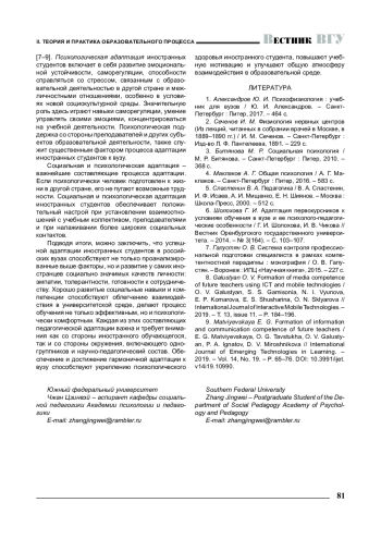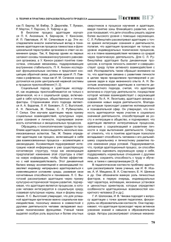 6. Шолохова Г. И. Адаптация первокурсников к условиям обучения в вузе и ее психолого-педагогические особенности / Г. И. Шолохова, И. В. Чикова // Вестник Оренбургского государственного университета. - 2014. - № 3(164). - С. 103-107.