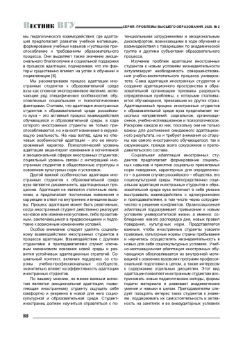 Социальная адаптация иностранных студентов предполагает формирование социальных навыков и принятие социально приемлемых норм поведения, характерных для определенного – в данном случае российского – общества, его социокультурной среды. Непосредственно социальная адаптация иностранных студентов к образовательной среде вуза включает в себя умение выстраивать взаимодействие с однокурсниками и преподавателями, в том числе через сотрудничество и решение конфликтов.